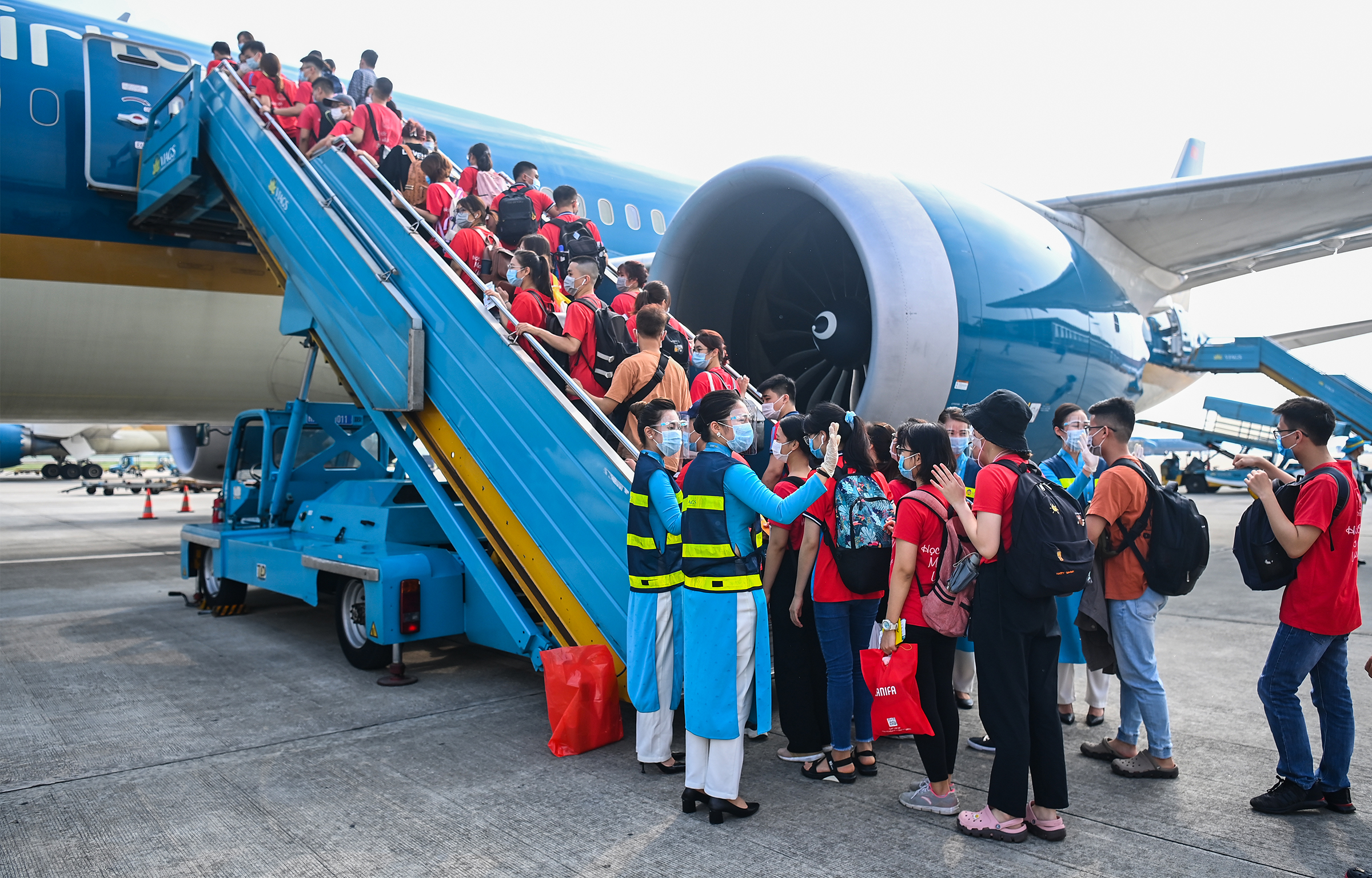Trong số đó, một chuyến bay đặc biệt chở đoàn y tế tỉnh Bắc Ninh đã được ghi lại qua ống kính của phóng viên ảnh Hoàng Giang Huy – báo VnExpress. Không có cảnh hoa lệ hay lễ tiễn long trọng, chỉ có hàng người trong trang phục giản dị lặng lẽ bước lên tàu bay, bên dưới là các tiếp viên Vietnam Airlines trong thiết bị bảo hộ đứng đó, vẫy chào, dõi theo.