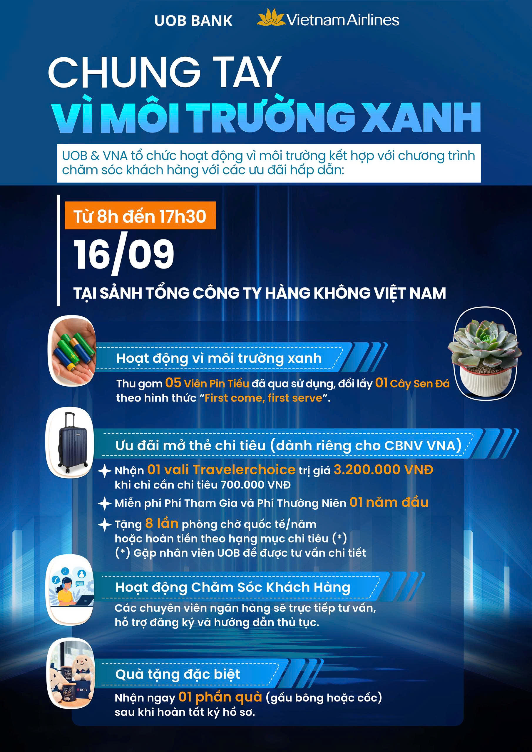 Không chỉ dừng ở đó, sự kiện còn mang đến những ưu đãi đặc biệt khi mở thẻ chi tiêu UOB, dành riêng cho cán bộ nhân viên Vietnam Airlines. Người tham gia sẽ nhận ngay 01 vali Travelerchoice trị giá 3,2 triệu đồng khi chi tiêu đủ điều kiện, đồng thời được miễn phí tham gia và phí thường niên năm đầu tiên. Ngoài ra, chủ thẻ còn được tặng 8 lần sử dụng phòng chờ quốc tế/năm hoặc hoàn tiền theo hạng mục chi tiêu.
