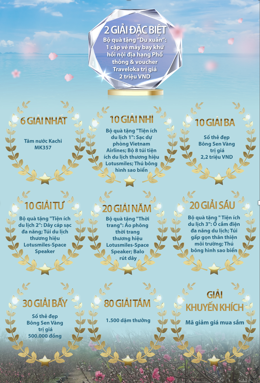 Ngoài ra, Quý hội viên còn có cơ hội trúng nhiều món quà ý nghĩa khác như tăm nước Kachi MK357 nhỏ gọn dễ dàng bỏ trong túi xách, bộ 8 túi tiện ích du lịch thương hiệu Lotusmiles, thú bông hình sao biển, áo phông thời trang thương hiệu Lotusmiles-Space Speaker, sạc dự phòng Vietnam Airlines…
