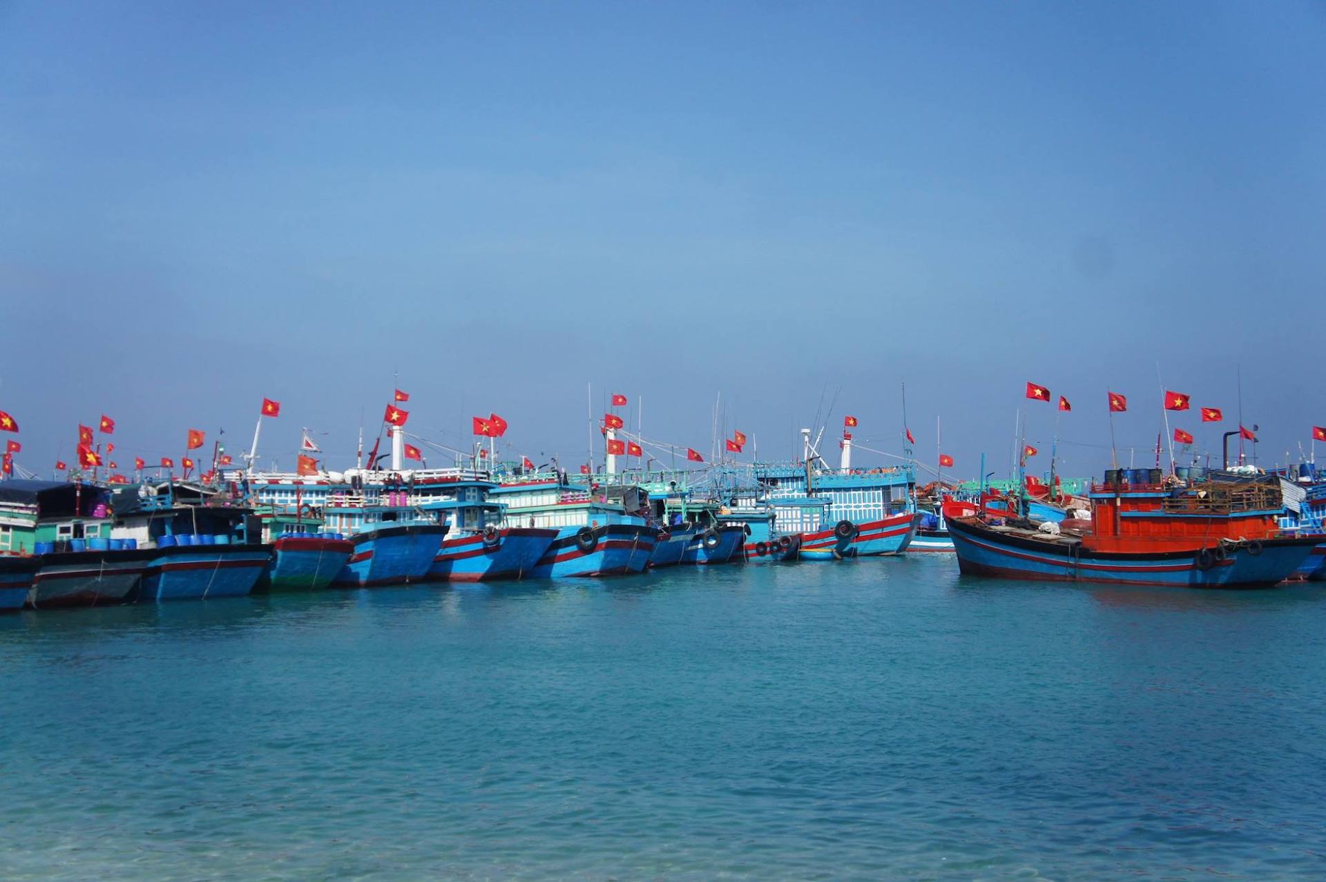 Nếu may mắn, khi lướt qua các bến thuyền bạn có thể bắt gặp bầu trời cờ đỏ sao vàng rợp trời của những con thuyền đã trở về neo đậu sau những tháng ngày lênh đênh trên biển. Có lẽ bạn sẽ muốn dừng lại một chút để ngắm nhìn sắc cờ rực rỡ đang tung bay trong gió trên nền biển và trời xanh ngắt như hòa làm một.