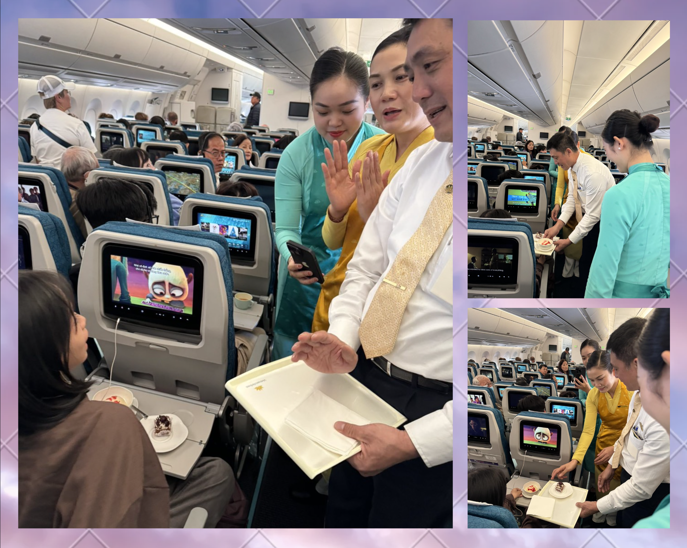 Ngay sau khi phục vụ hành khách bữa trưa, TVT Trọng Danh cùng tổ tiếp viên đã dùng bánh ngọt và kem có sẵn trên chuyến bay mang xuống tặng cô bé. Lời ca chúc mừng sinh nhật vang lên trong một không gian đặc biệt, dưới ánh mắt tràn đầy niềm vui của các hành khách xung quanh khiến “chủ nhân” bữa tiệc đôi chút ngại ngùng nhưng không giấu được niềm hạnh phúc và bất ngờ.