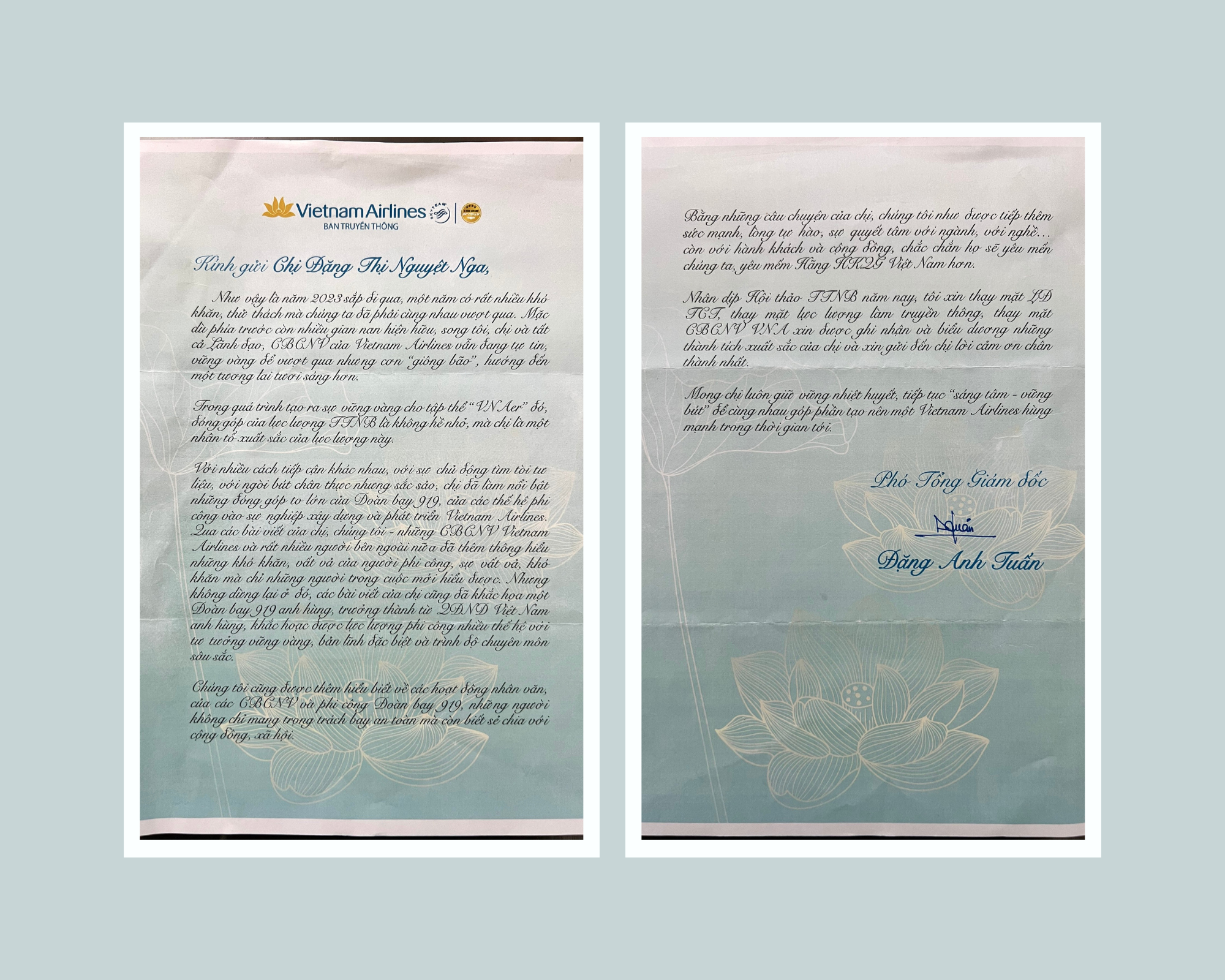 Rất may mắn là tôi đã nhận được những định hướng, chỉ đạo từ lãnh đạo Đoàn bay, sự quan tâm, tạo điều kiện và sự ủng hộ nhiệt tình từ các đơn vị trong Đoàn bay cũng như sự hỗ trợ chuyên môn chu đáo của đội ngũ những anh chị em làm công tác TTNB của TCT. Tất cả những điều quý báu ấy đã giúp tôi hoàn thành được những mảng công việc TTNB của Đoàn bay trong thời gian qua.
