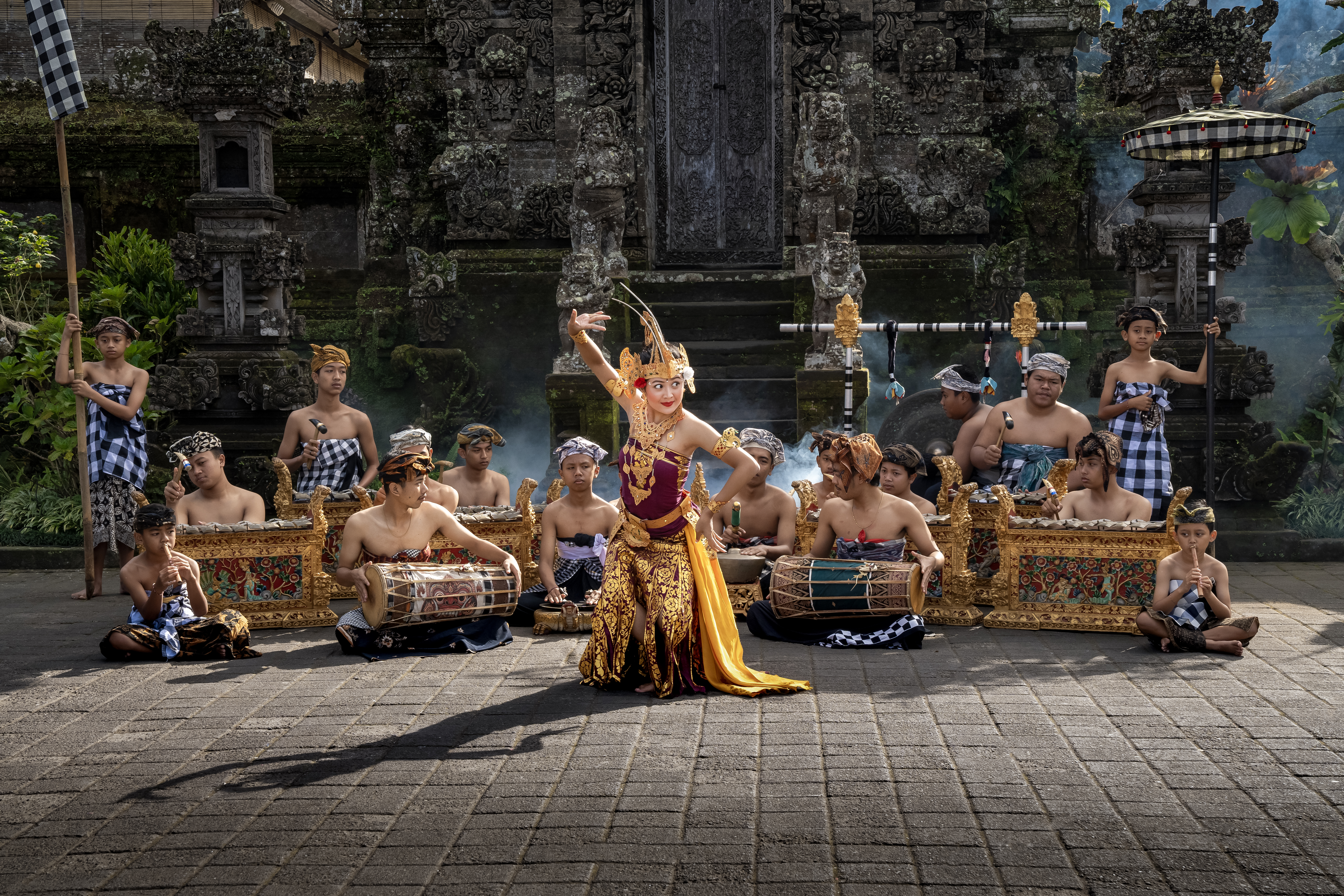 Sau 16 giờ là khoảng thời gian khách du lịch thưa dần. Ngôi làng trở nên rực rỡ sắc vàng óng khi chiều tà. Lúc này người dân bắt đầu soạn lễ để dâng vào đền. Cánh phụ nữ thường chọn những bộ váy áo truyền thống sặc sỡ đi lễ. Họ di chuyển nhẹ nhàng, khéo léo qua lối đi lên đồi cao với chiếc giỏ tre đội trên đầu.