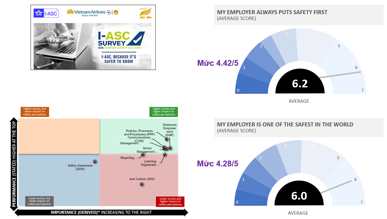 Thực hiện kết luận UBAT, một số chương trình lớn trong năm đã được triển khai như: Chương trình khảo sát VHAT của IATA trong tháng 9-10 ghi nhận sự hưởng ứng tích cực của gần 10.000 CBNV TCT với kết quả rất thành công so với 2020, sau đại dịch Covid: đạt mức 6,2/7, tương đương 4,42/5 (năm 2020 đạt mức 4/5); Chương trình quản trị rủi ro yếu tố tự nhiên chim và động vật hoang dã tại các sân bay HAN-DAD-SGN và một số sân bay địa phương với sự tư vấn của các chuyên gia nước ngoài và Việt Nam; Rà soát, cập nhật và hiệu chỉnh Chính sách ATCL của TCT (Phiên bản 05) trong đó cập nhật các nội dung về VHAT đã cam kết theo Hiến chương VHAT ký giữa VNA-IATA trong khuông khổ Hội nghị An toàn và Khai thác toàn cầu của IATA tổ chức tại Hà Nội tháng 9/2023; Thúc đẩy VHAT thông qua các lớp huấn luyện, tập huấn nâng cao nhận thức an toàn, VHAT/VH báo cáo tại các ĐV.