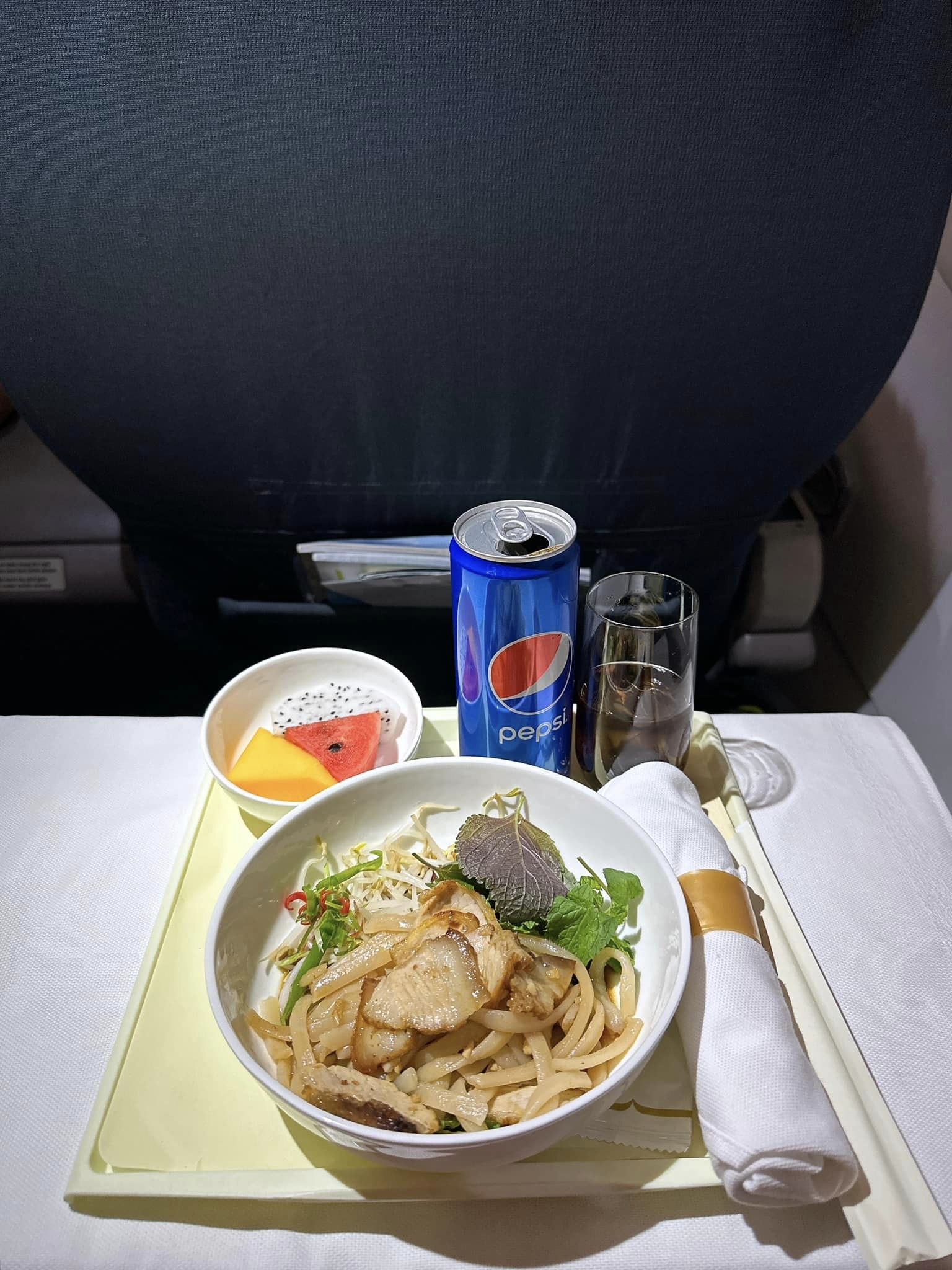 Khi lên máy bay, Đ.B tiếp tục ấn tượng với ghế ngồi hạng Thương gia của Vietnam Airlines. Ghế ngồi rộng rãi, thoải mái, kèm theo màn hình cảm ứng lớn và đèn đọc sách, mang lại trải nghiệm bay thư giãn và tiện lợi. Đặc biệt, dịch vụ ăn uống trên khoang Thương gia của Vietnam Airlines cũng không làm anh thất vọng. Suất ăn được bày trí bắt mắt, đa dạng và đạt tiêu chuẩn về chất lượng, từ những bữa ăn nhẹ kèm đồ uống dinh dưỡng cho các chuyến bay ngắn đến các bữa ăn đầy đủ cho các chặng bay dài.