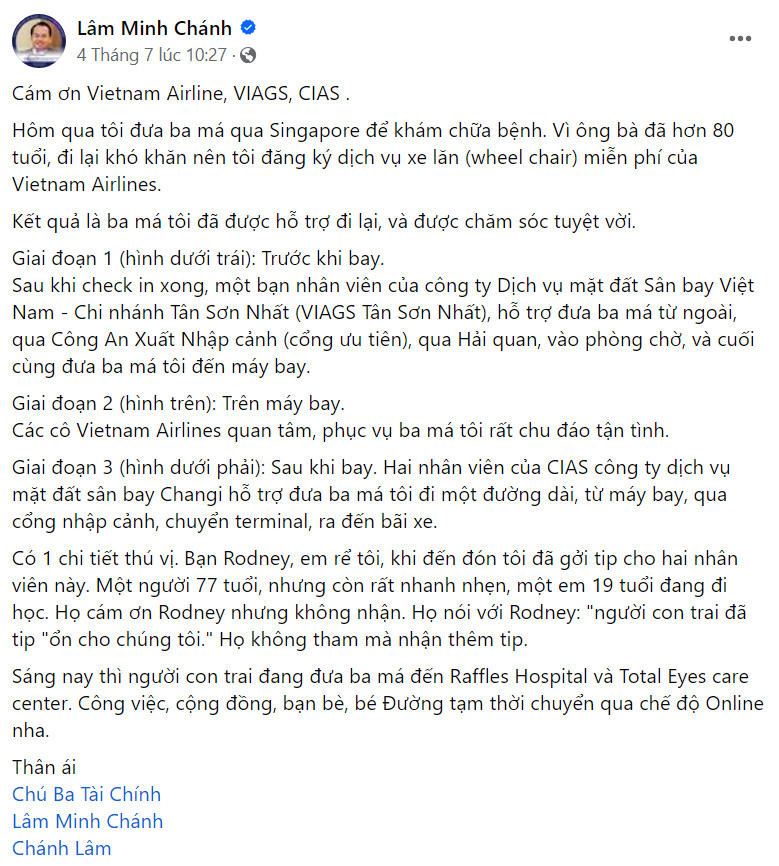 Dưới đây là những lời cảm ơn của anh Lâm Minh Chánh gửi đến nhân viên Vietnam Airline, VIAGS, CIAS: