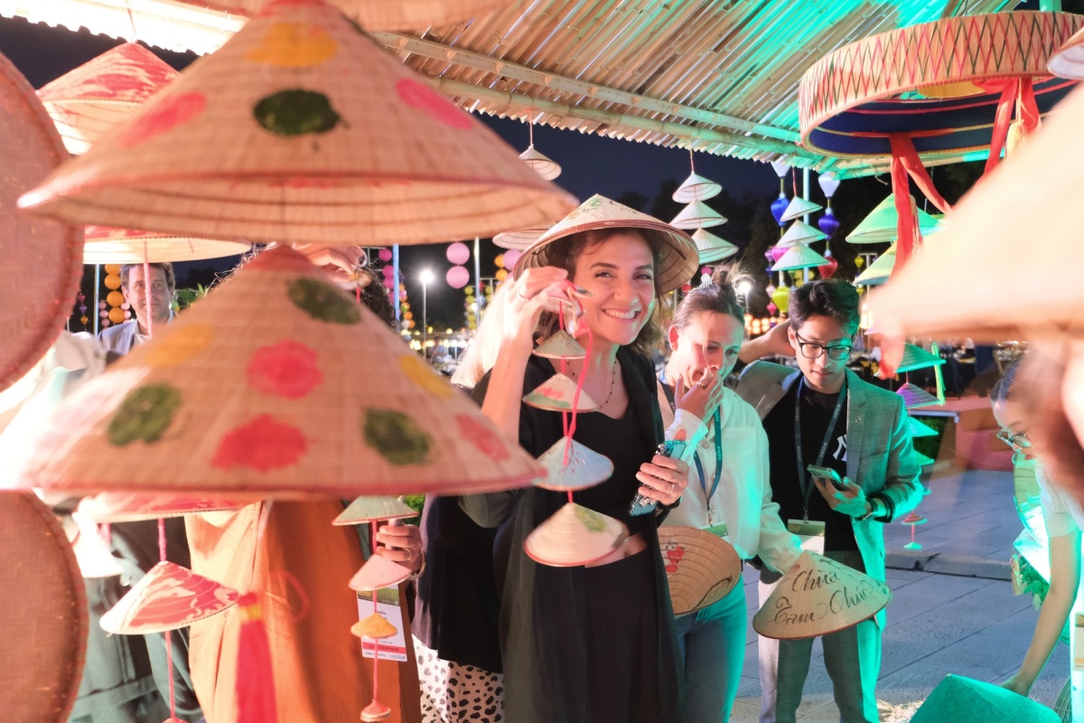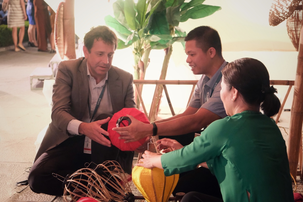 Tại sự kiện, các khách mời quốc tế còn được trải nghiệm tự tay vẽ nón lá, làm đèn lồng.