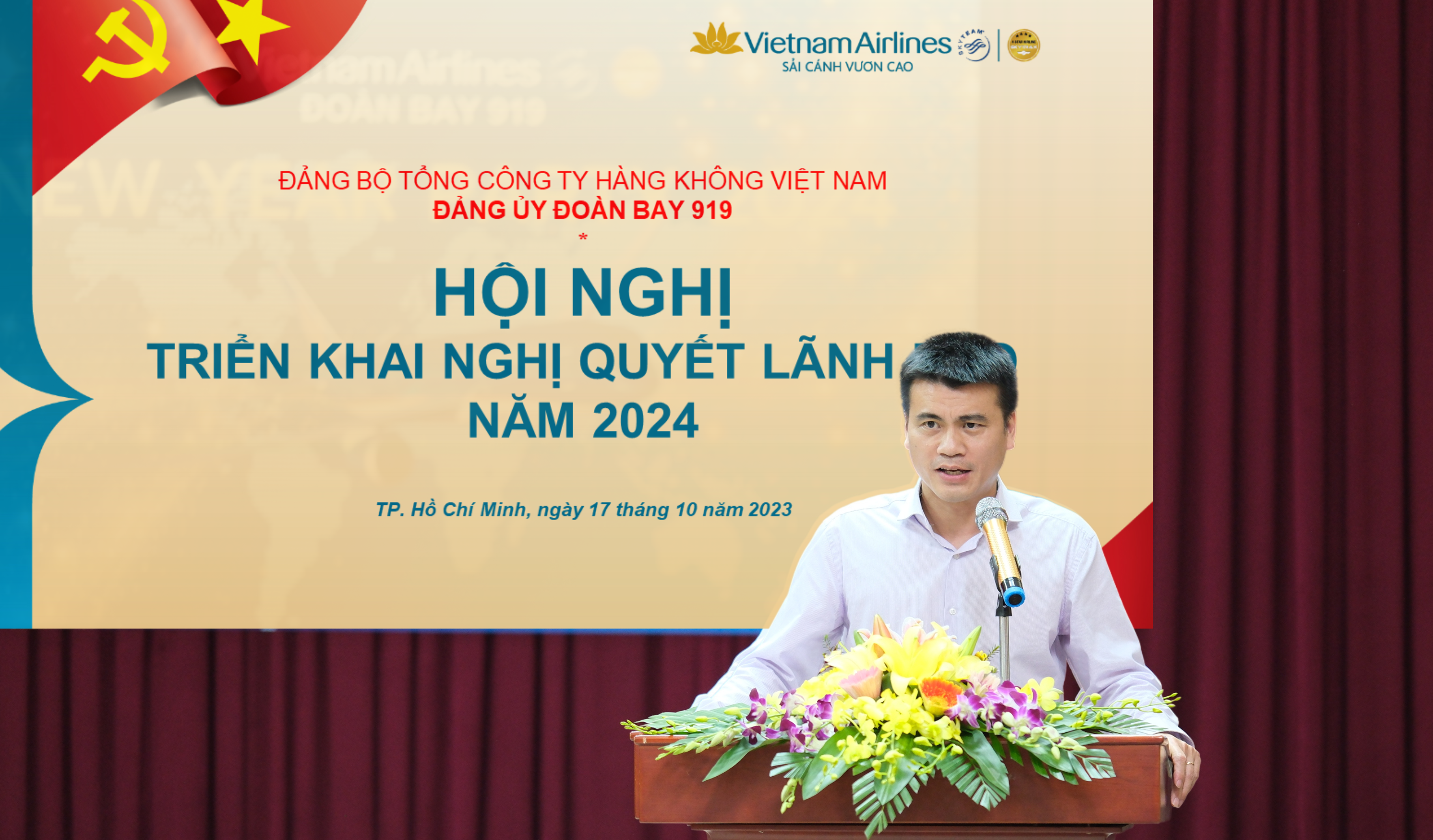 Đồng chí Tô Ngọc Giang, TVĐU TCT, Bí thư Đảng ủy, Đoàn trưởng, chủ trì Hội nghị triển khai nghị quyết lãnh đạo thực hiện nhiệm vụ của Đảng bộ Đoàn bay. (Ảnh: VNA)