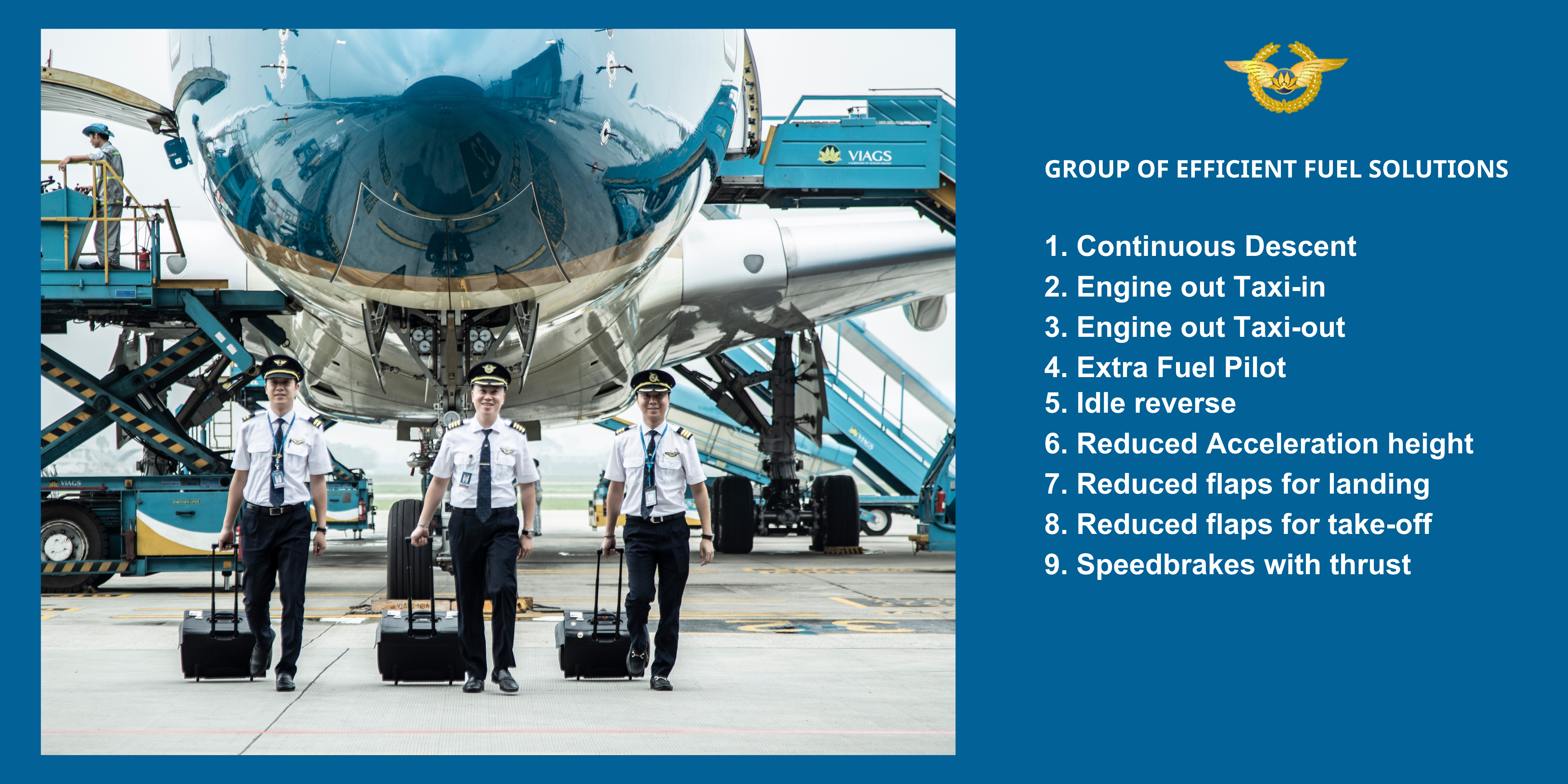 Cùng với đó, các Đội bay, các Nhóm phi công đã nghiên cứu, áp dụng triển khai nhiều giải pháp đồng bộ mang lại hiệu quả cao. Nhận thức sâu sắc việc tiết kiệm chi phí khai thác, tiết kiệm nhiên liệu trước hết là trách nhiệm của từng phi công và từng đội bay, cấp ủy và lãnh đạo các Đội bay đã làm tốt công tác giáo dục chính trị tư tưởng cho cán bộ, phi công nói chung, đặc biệt là các chức danh cán bộ, đảng viên nòng cốt tham gia trực tiếp vào công tác quản lý Đội, Nhóm, các phi công kiêm nhiệm công tác chuyên môn, thành viên Tổ Kỹ thuật khai thác – Tiết kiệm nhiên liệu, để mỗi người nêu cao tinh thần tự giác, gương mẫu đi đầu trong việc thực hành tiết kiệm chi phí khai thác.