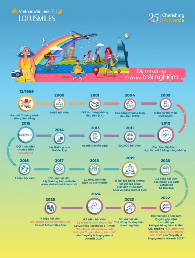 Lotusmiles – chương trình khách hàng thân thiết của Vietnam Airlines, đã ghi dấu ấn mạnh mẽ trong lòng khách hàng suốt hơn 25 năm phát triển. Ra mắt vào ngày 17/12/1999, Lotusmiles hiện đã thu hút hơn 7 triệu hội viên, khẳng định triết lý cốt lõi “khách hàng là trung tâm”. Chương trình không ngừng mở rộng, mang đến cho hội viên những cơ hội trải nghiệm dịch vụ hàng không đẳng cấp và khác biệt.