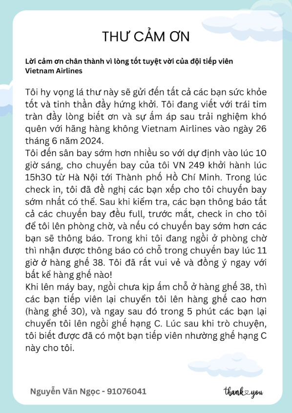 Khách hàng Nguyễn Văn Ngọc gửi lời cảm ơn tới Vietnam Airlines vì sự chu đáo và tận tâm của đội ngũ nhân viên, đặc biệt là tiếp viên Đinh Thị Dung 4 và tiếp viên trưởng Nguyễn Ngọc Lan 3 trên chuyến bay VN211 từ Hà Nội đến TP. Hồ Chí Minh ngày 26/6 vừa qua.