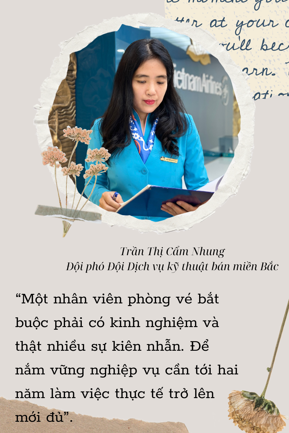 Nhớ lại những ngày đầu bước chân vào quá trình đào tạo để trở thành một nhân viên phòng vé, chị Cẩm Nhung cho biết, những tháng ngày ấy như một thời kỳ đầy chông gai. Ba tháng, rồi sáu tháng trôi qua với rất nhiều bài học và những buổi thực hành, nhưng chỉ khi bắt tay vào làm việc, chị mới nhận ra rằng, có rất nhiều điều phát sinh phải học từ trải nghiệm thực tế mới có kết quả.