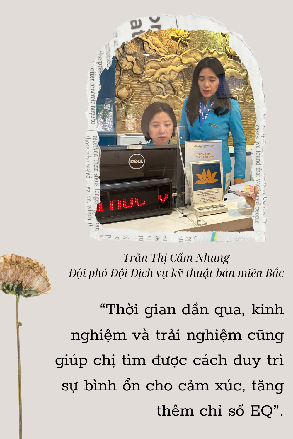 Chị Nhung tâm sự: “Trước đây, hôm nào tinh thần “đi xuống”, chị đều  phải đứng trước gương, cố gắng định thần lại bản thân trong khoảng thời gian ngắn nhất. Rồi học cách mỉm cười thật tươi trước khi bước chân đi làm. Nhưng thời gian dần qua, kinh nghiệm và trải nghiệm cũng giúp chị tìm được cách duy trì sự bình ổn cho cảm xúc, tăng thêm chỉ số EQ. Bây giờ, chỉ cần nói chuyện với khách hàng 2 – 3 câu là đủ để biết cách xử lý mọi tình huống rồi.”