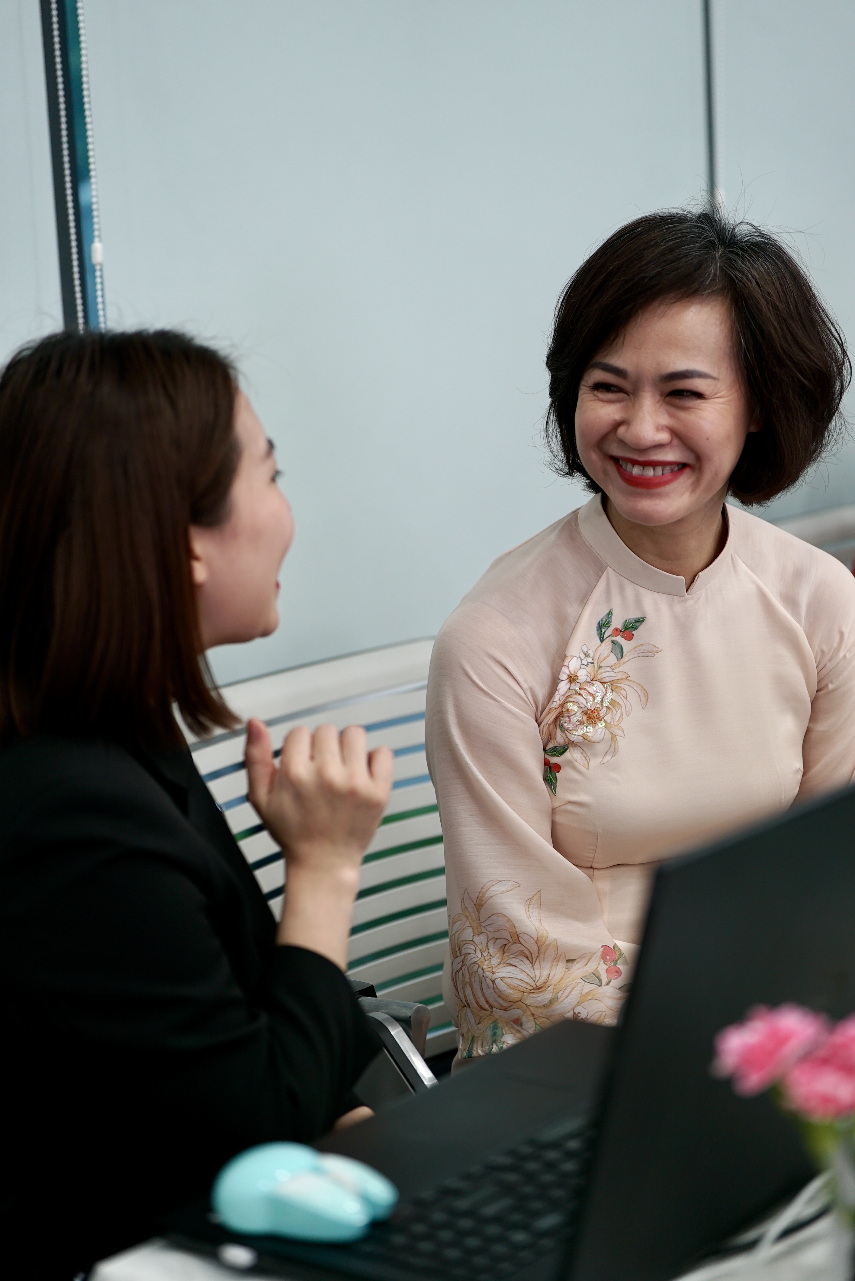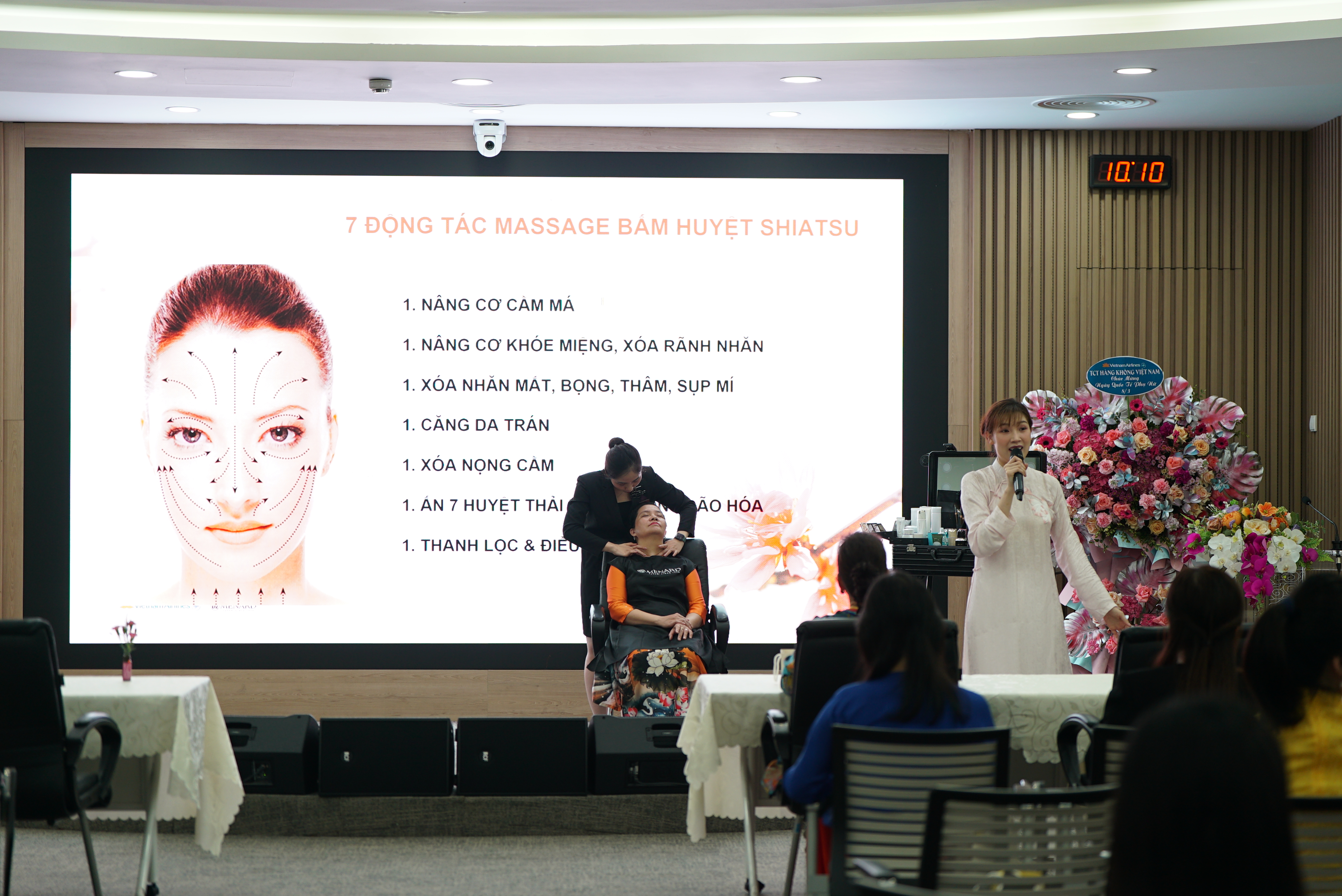 Các CBNV nữ trong TCT đã có cơ hội trải nghiệm soi da chuyên sâu bằng thiết bị CNC ARAM HUVIS, tham gia massage tại chỗ và được các chuyên gia da liễu tư vấn cá nhân hóa phác đồ chăm sóc da.
