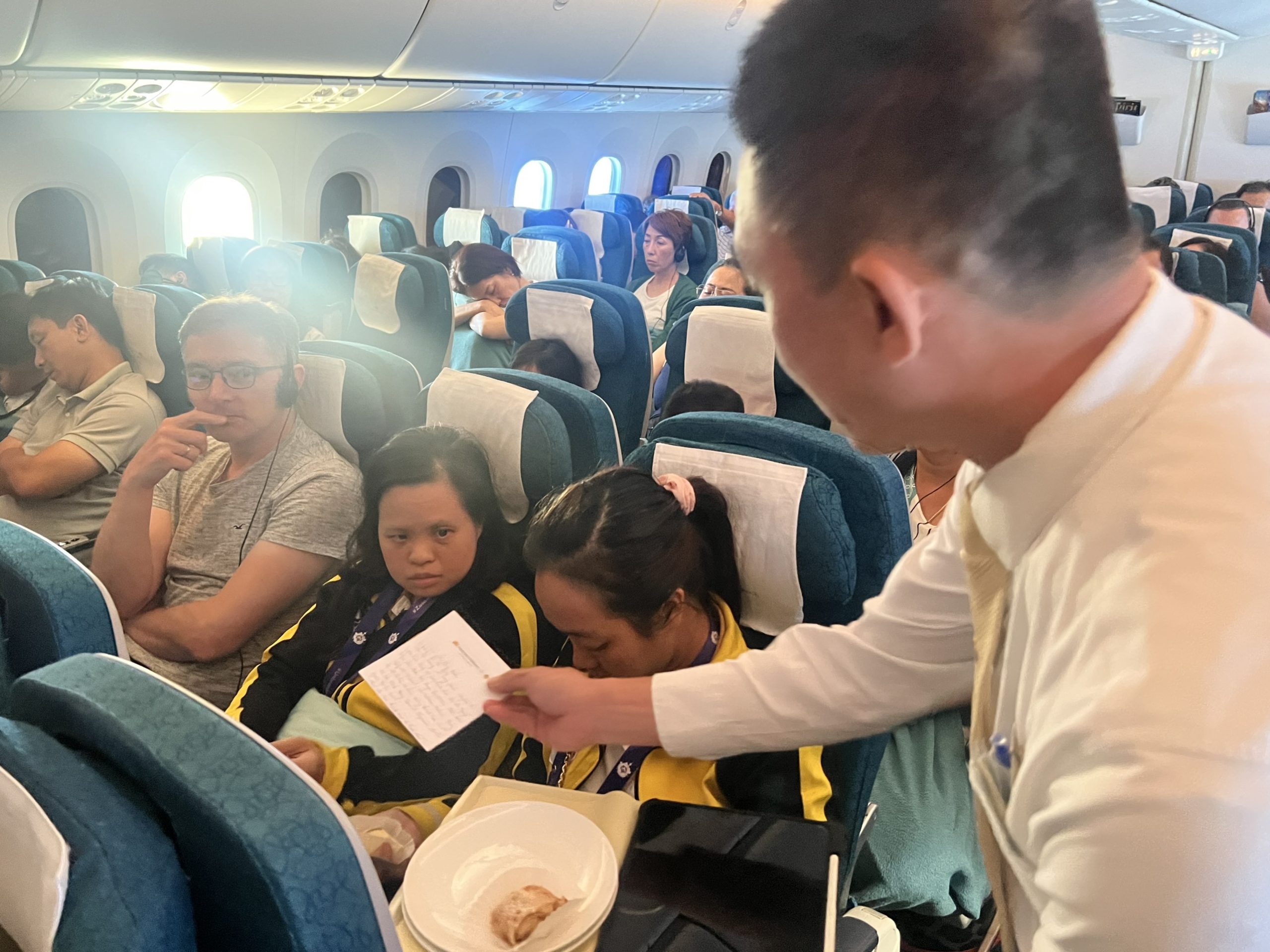 Phi hành đoàn luôn tận tâm quan tâm và phục vụ đoàn trên những chuyến bay. (Ảnh: ĐTV).