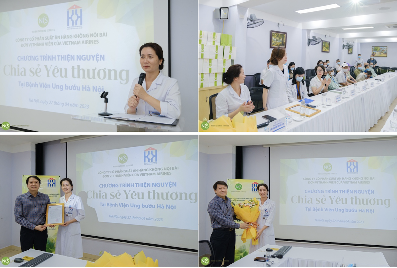 Buổi lễ thiện nguyện diễn ra tại phòng họp tầng 2, nhà B thuộc Bệnh viện Ung bướu Hà Nội với sự tham gia của ông Phạm Xuân Thắng – Phó Tổng Giám đốc Công ty Cổ phần Suất ăn Hàng không Nội Bài cùng đoàn thiện nguyện đại diện cho đơn vị, bà Nguyễn Thị Mai Lan – Phó Giám đốc Bệnh viện Ung Bướu Hà Nội cùng với các y bác sĩ và bệnh nhân đại diện cho các khoa tại viện.