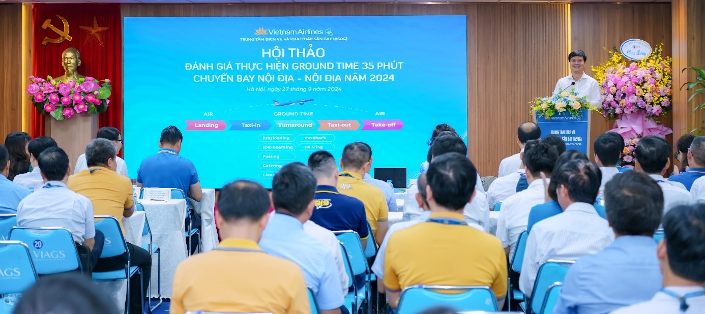 Tại hội thảo, Phòng Điều hành – ASOC đã trình bày Báo cáo kết quả triển khai thực hiện chuyến bay theo Ground time 35 phút: TCT triển khai thử nghiệm GT35’ tàu bay A321 hành trình nội địa – nội địa trong nhiều giai đoạn: Giai đoạn 41 ngày (từ ngày 20/08/2023 đến ngày 30/09/2023) và kế hoạch triển khai trong 07 tháng tiếp theo (từ ngày 15/11/2023 đến ngày 14/06/2024). Đặc biệt là giai đoạn áp dụng thử nghiệm tiếp từ ngày 05/07/2024 đến nay, ASOC đã triển khai quy trình, tiêu chuẩn các công đoạn dịch vụ đến nhân viên, cán bộ, đối tác liên quan về kế hoạch, quy trình thực hiện, sẵn sàng thiết bị và nhân lực phục vụ chuyến bay theo kế hoạch GT35’. Ngoài ra, ASOC đã thành lập tổ công tác rút ngắn GT35’ (14 người) để triển khai, giám sát, kịp thời xử lý các khó khăn, vướng mắc và báo cáo TCT đầy đủ.