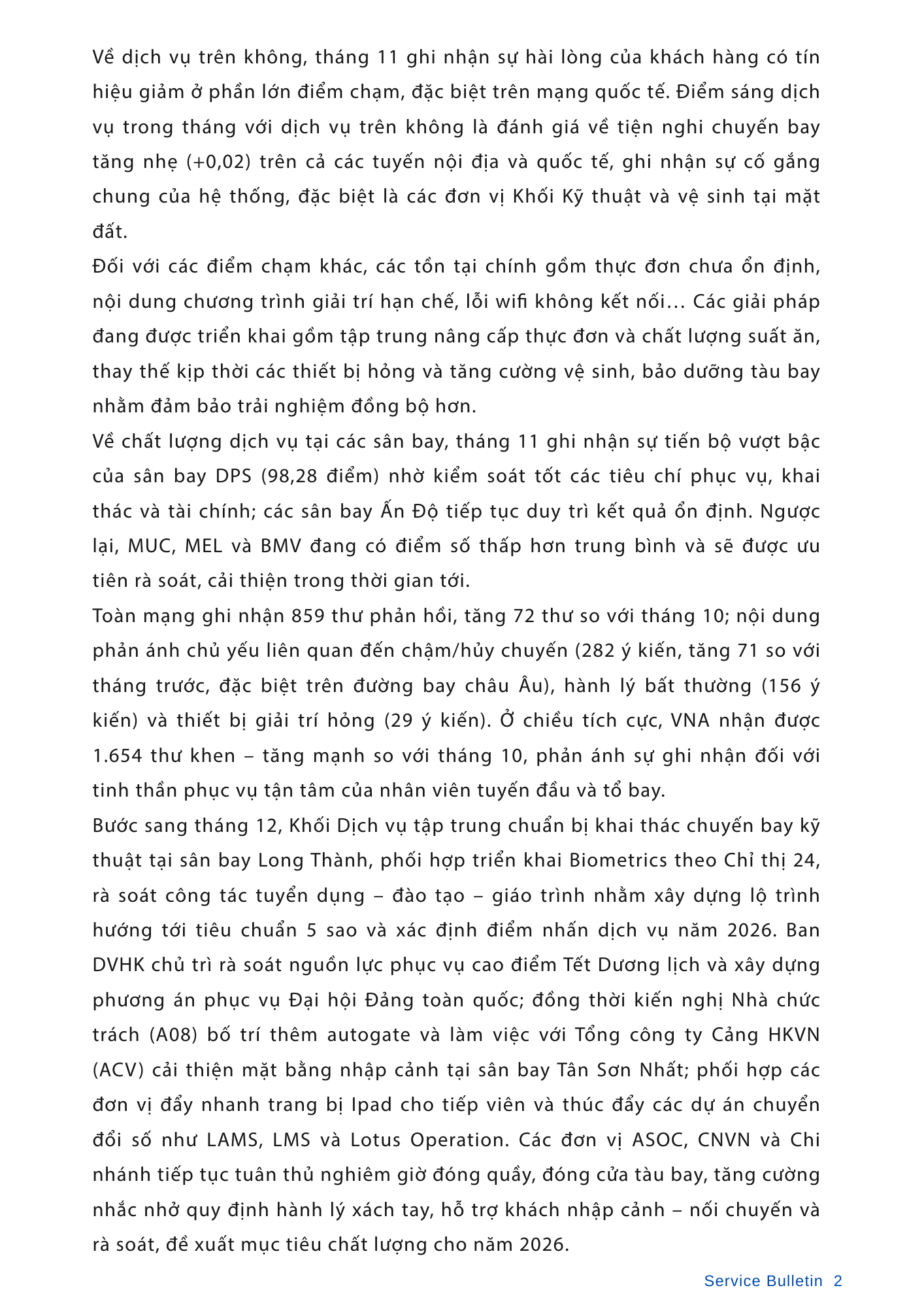 Chất lượng dịch vụ trong tháng 11 ổn định mặc dù các điều kiện khai thác trong tháng tiếp tục chịu ảnh hưởng nặng nề của tình hình bão lũ.