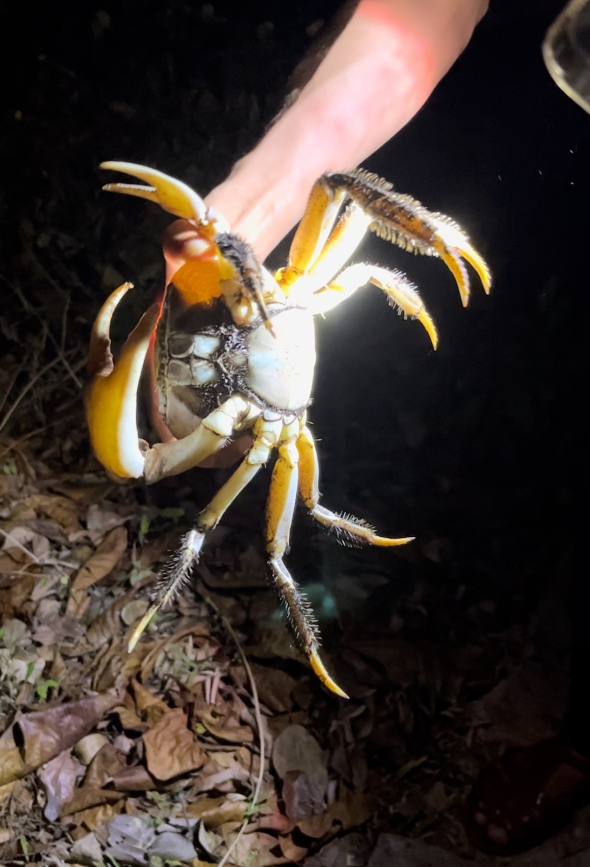 Tiếng lá rụng xoạt hoạt trong rừng, một trong những anh kiểm lâm đã chiếu đèn và phát hiện ra một con cua xe tăng, đang cố gắng lẩn trốn. Lựa tay tóm mai cua, anh chiếu đèn để chúng tôi thấy cặp càng khỏe mạnh và những cái chân lông lá. Đây cũng là một. trong những loài cua đang nằm trong danh sách được bảo tồn.