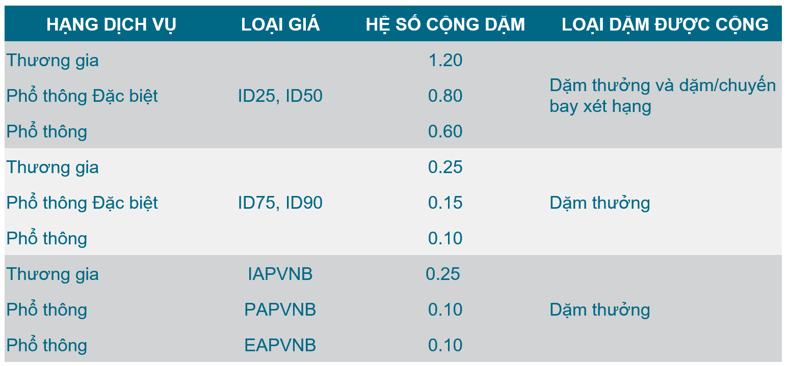 Hội viên Lotusmiles được tích dặm cho những chuyến bay bằng vé LB, ID, kể cả vé ID90. Hệ số cộng dặm cho từng loại vé như sau: