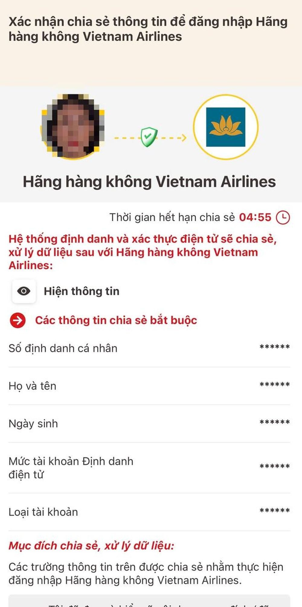 Bước 5: Sau khi xác nhận đồng ý về quy định, mục đích chia sẻ, xử lý dữ liệu, hành khách được chuyển hướng sang ứng dụng hãng hàng không để hoàn thiện quá trình làm thủ tục trực tuyến và xác thực danh tính (eKYC).