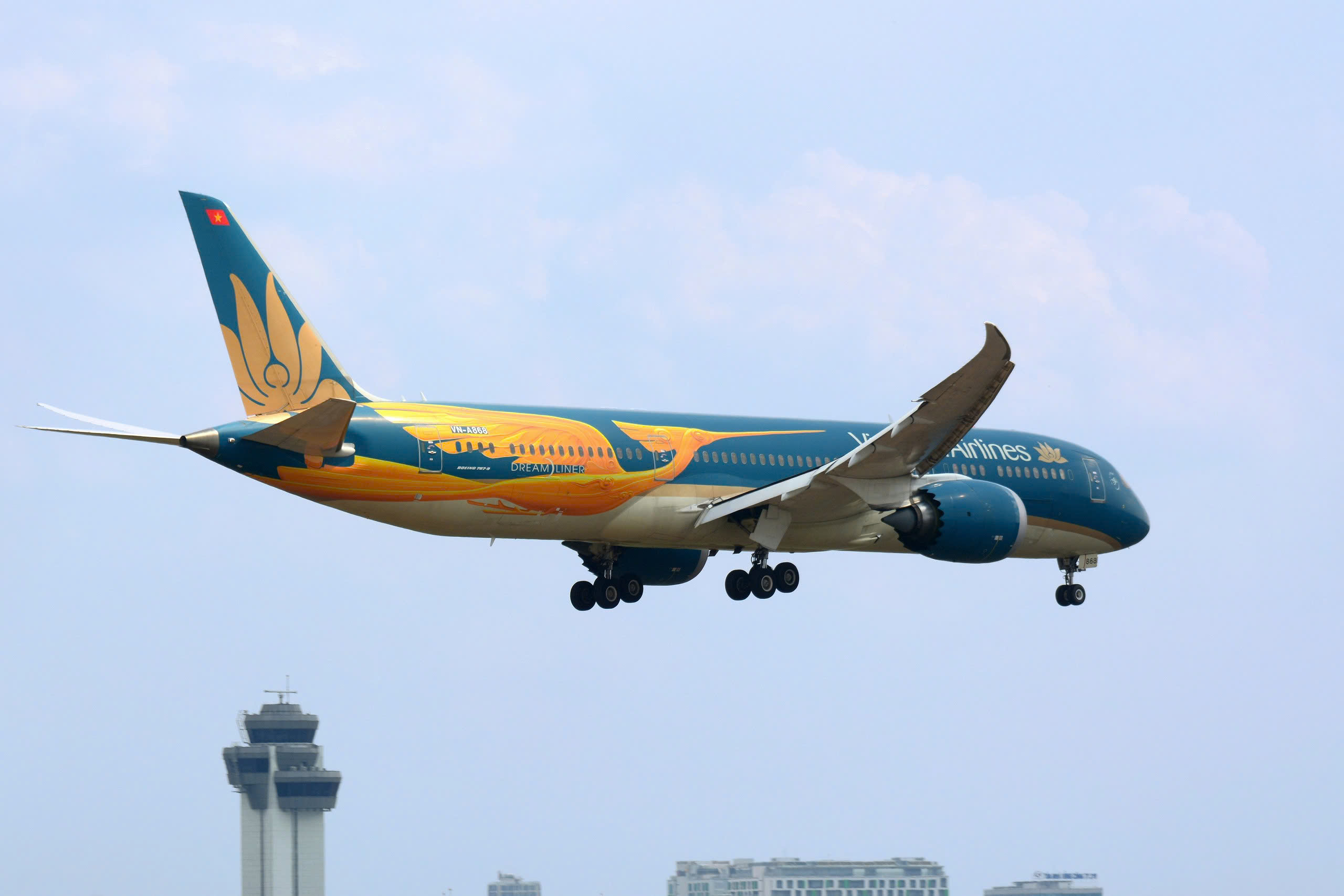 Chiếc Boeing 787 Dreamliner mang biểu tượng Chim Lạc – biểu tượng kỷ niệm 30 năm Vietnam Airlines đang bay lên từ đường băng Tân Sơn Nhất, vẽ nên một hành trình đầy khát vọng trên nền trời trong xanh.