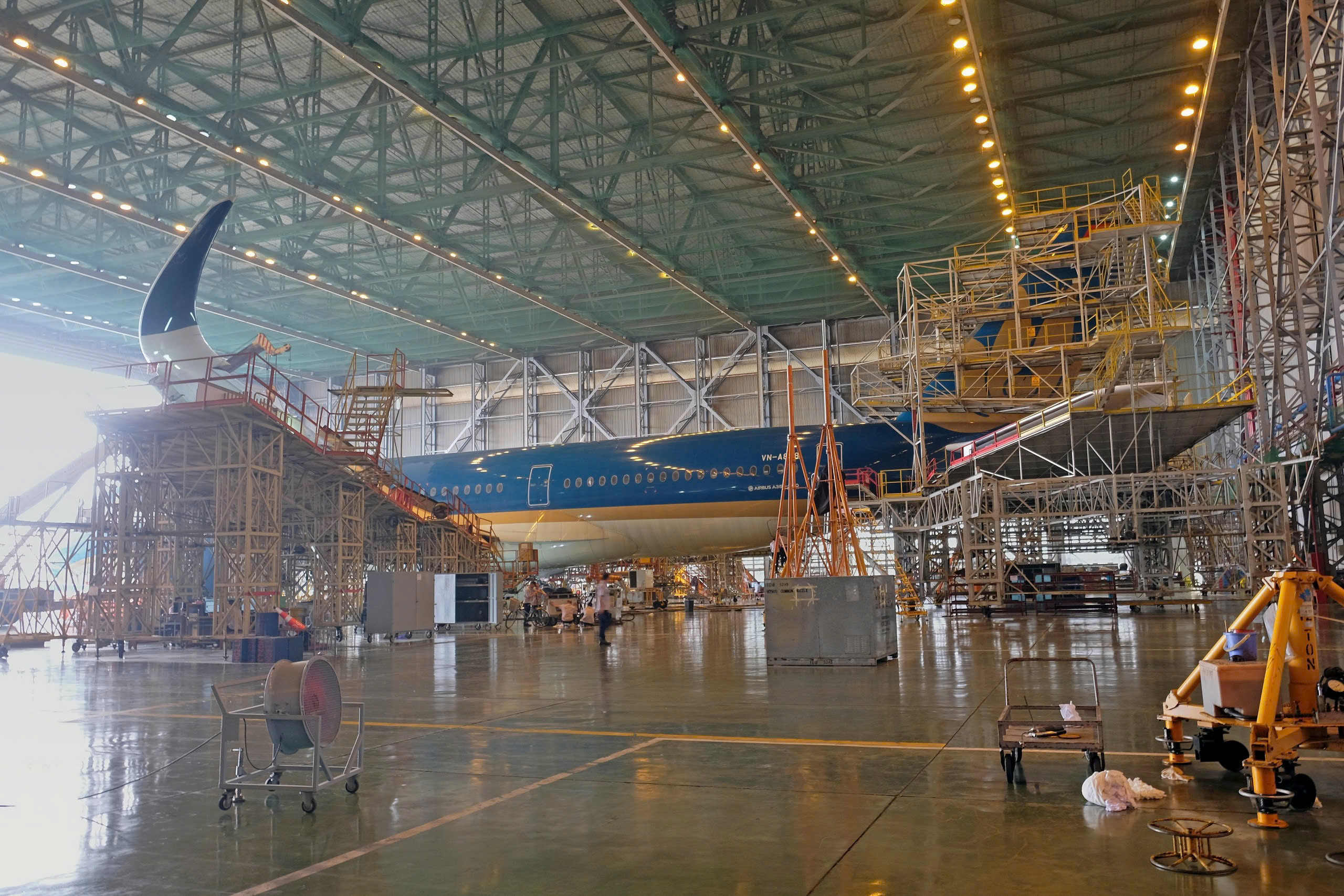 Hình ảnh chiếc máy bay thân rộng nằm trong khu bảo dưỡng kỹ thuật với dàn khung thép đồ sộ bao quanh – nơi những “kỹ sư của bầu trời” đang làm việc âm thầm để mỗi chuyến bay được an toàn tuyệt đối.