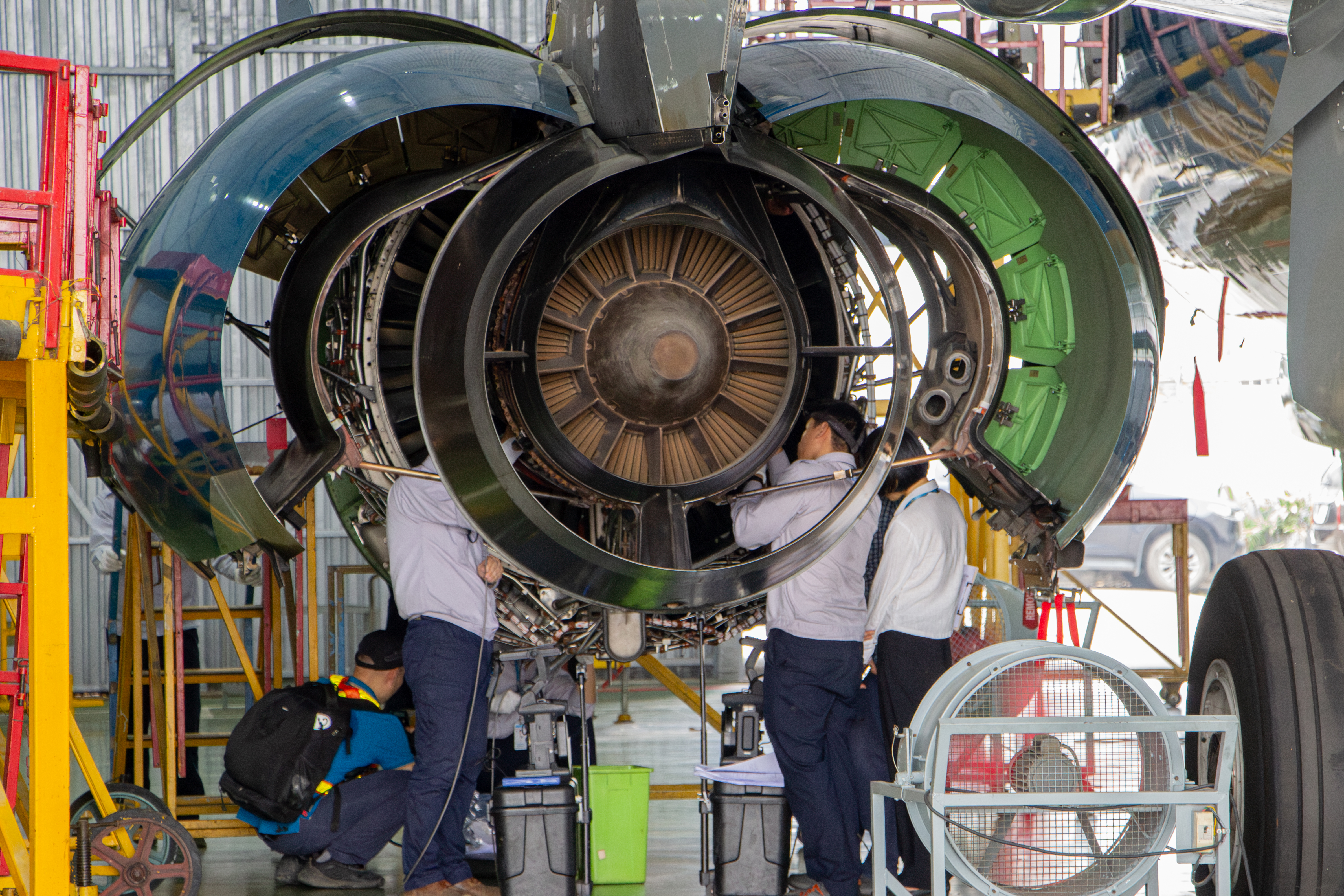 Ảnh 2: Đội ngũ VAECO bảo trì động cơ phản lực trong nhà chứa