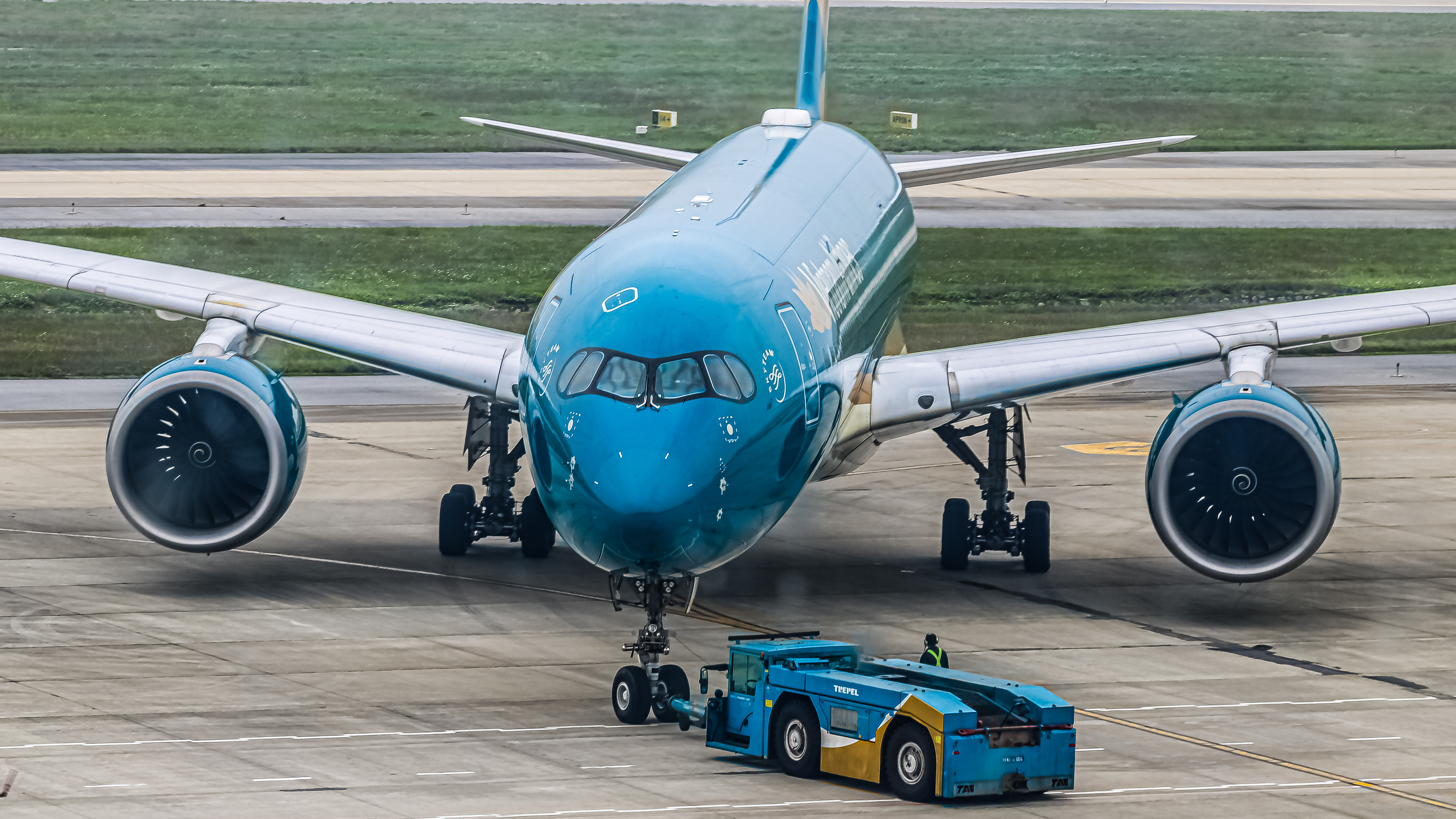 Ảnh 1: Tàu bay đang được đẩy lùi để chuẩn bị cho hành trình mới.