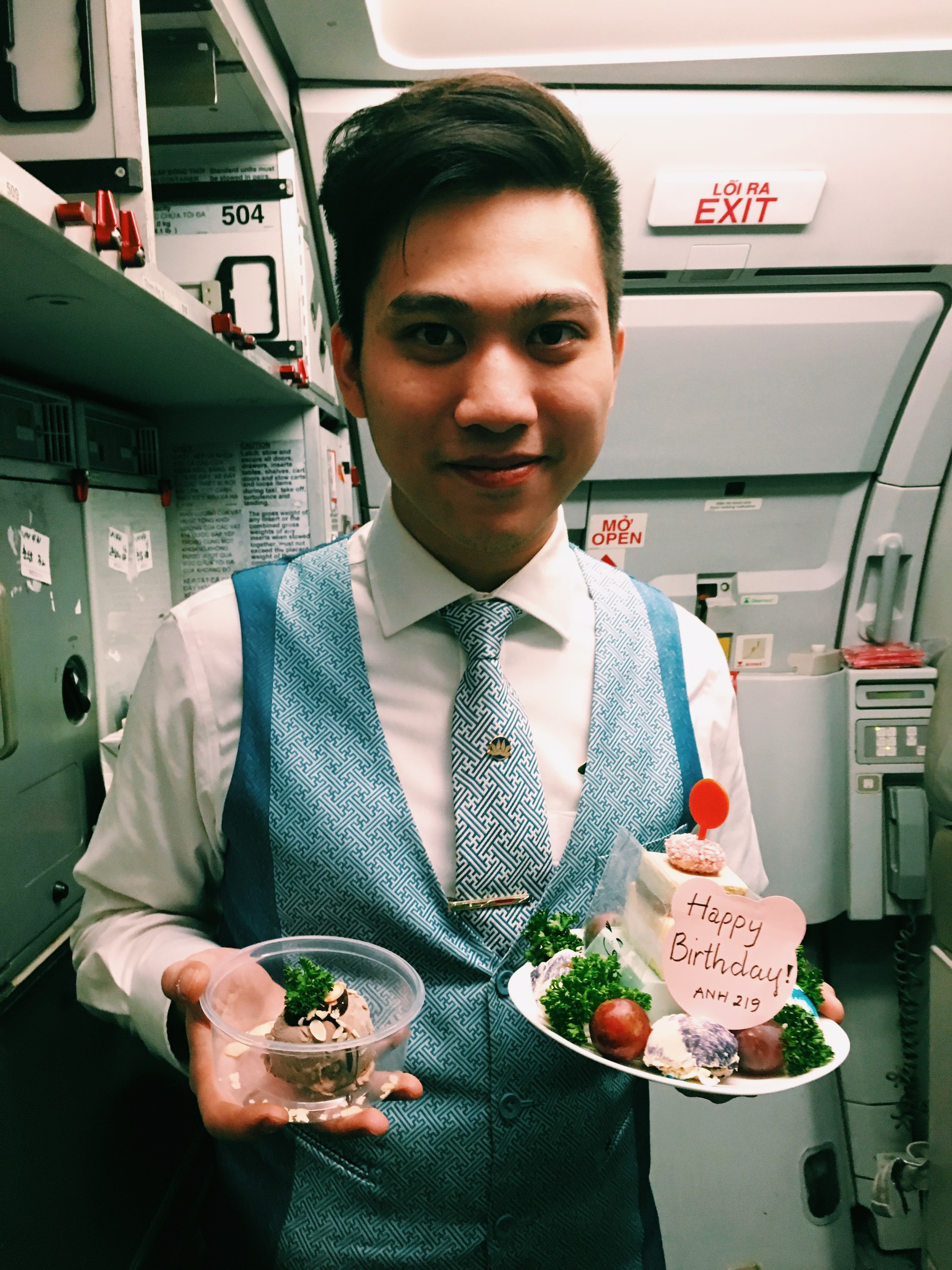 Đối với anh, kỉ niệm đáng nhớ nhất trên hành trình cống hiến cho Hãng hàng không Quốc gia chắc hẳn là ngày bản thân được tổ chức sinh nhật lần đầu tiên trên máy bay bởi những người đồng nghiệp dễ thương.