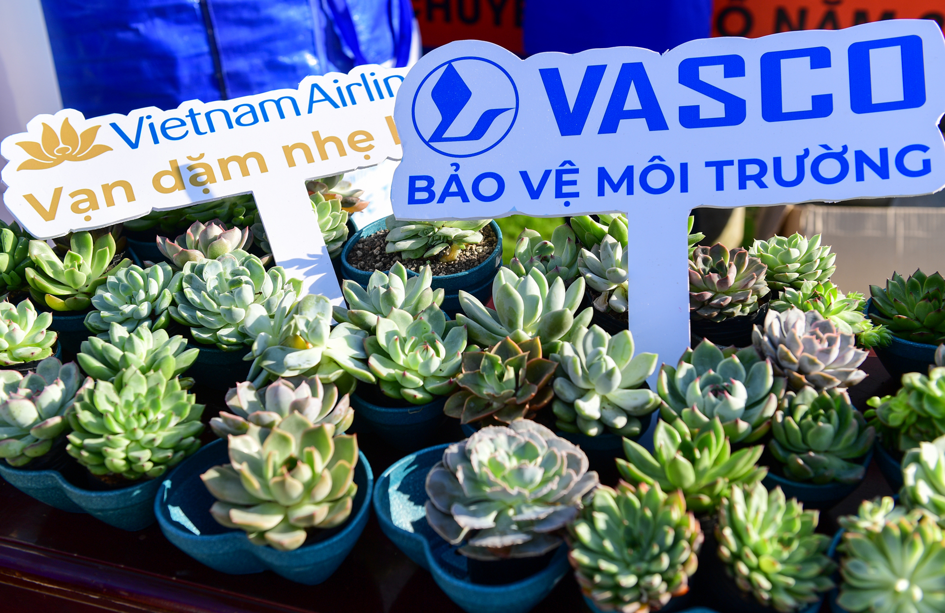 Chậu cây xanh được làm từ nguyên liệu tái chế được ban tổ chức chuẩn bị với những cây hoa xanh tốt.
