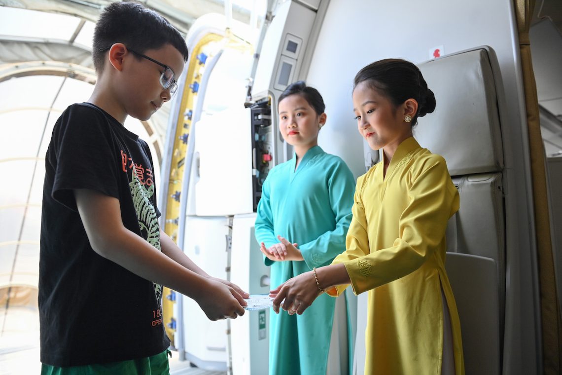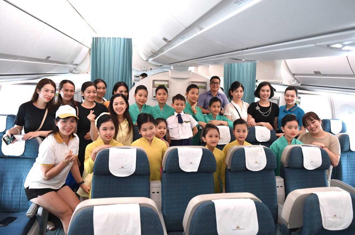 Chuyến bay chào đón sự xuất hiện của phi hành đoàn “nhí” với thành viên là các em nhỏ được tuyển chọn tham gia chương trình “Chuyến bay cho em”. (Ảnh: VNA).