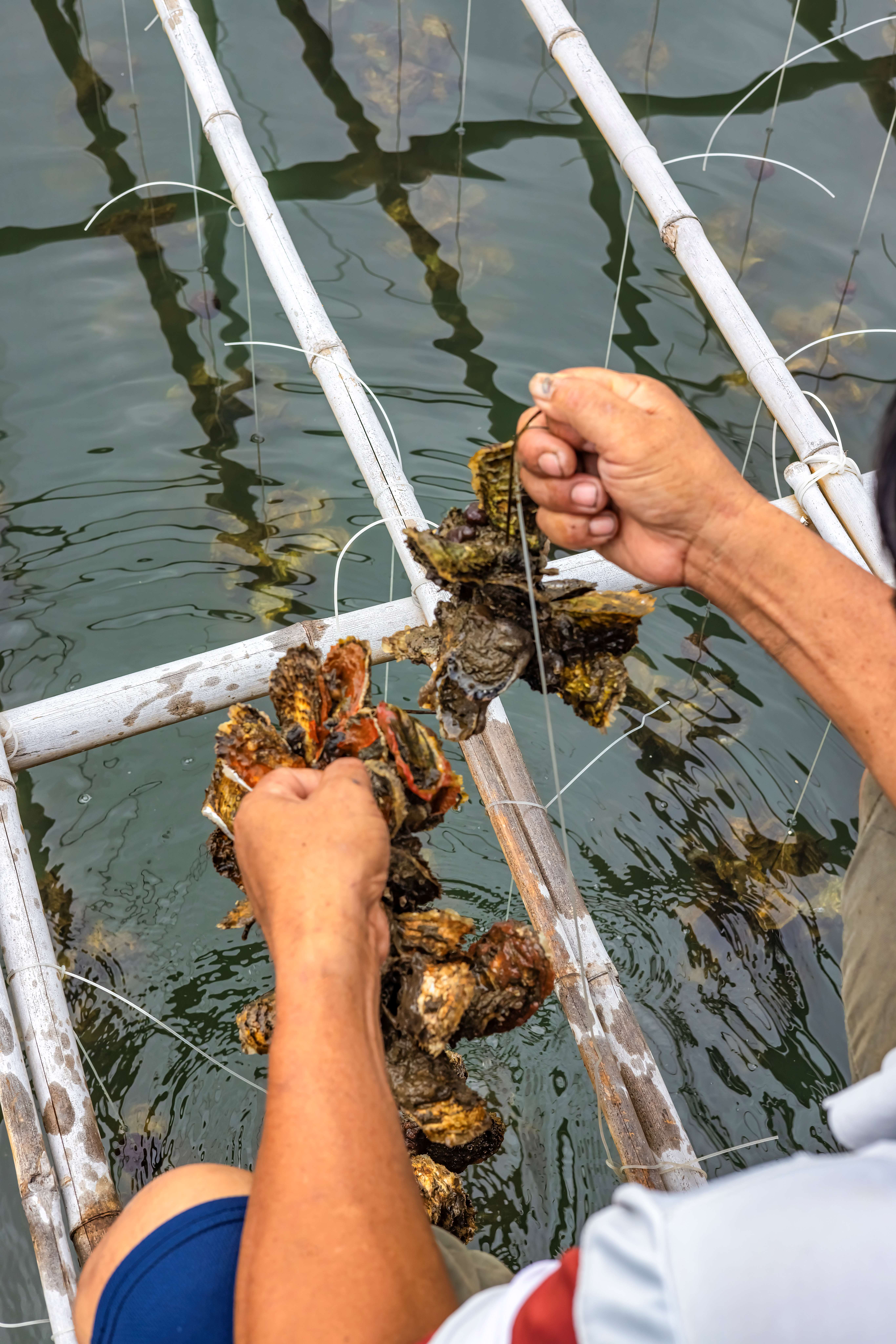 Khu vực này sở hữu vị trí ngay cửa biển, nhiệt độ và độ mặn của nước ổn định và phù hợp, lại thêm những khu rừng ngập mặn – nơi có nhiều sinh vật phù du là thức ăn tự nhiên, thuận lợi cho sự sinh trưởng của loài hàu. Trước đây bà con chủ yếu nuôi giống hàu đá bản địa vỏ dày thịt mỏng, nuôi cả năm mới thu hoạch. Từ năm 2014, giống hàu sữa (hàu Thái Bình Dương) được nghiên cứu nuôi thành công, thu hoạch sau 5 – 6 tháng. Hàu sữa vỏ mỏng và mềm hơn hàu đá, thịt hàu sữa cũng dày và đem lại lợi ích kinh tế cao hơn. Cách nuôi hàu đơn giản và phổ biến nhất là nuôi theo giàn – treo các sợi dây có buộc các giá thể nuôi hàu sữa dưới đáy bè. Với mỗi sợi treo 4 – 5 giá thể, một khung bè thông thường diện tích 36m2 sẽ treo khoảng 2.000 giá thể (400 dây), thu hoạch khoảng 300 – 400kg hàu vỏ. Sản lượng hàu sữa hàng năm ở khu vực này đạt khoảng 2.000 tấn hàu vỏ (loại 20 – 30 con/kg).