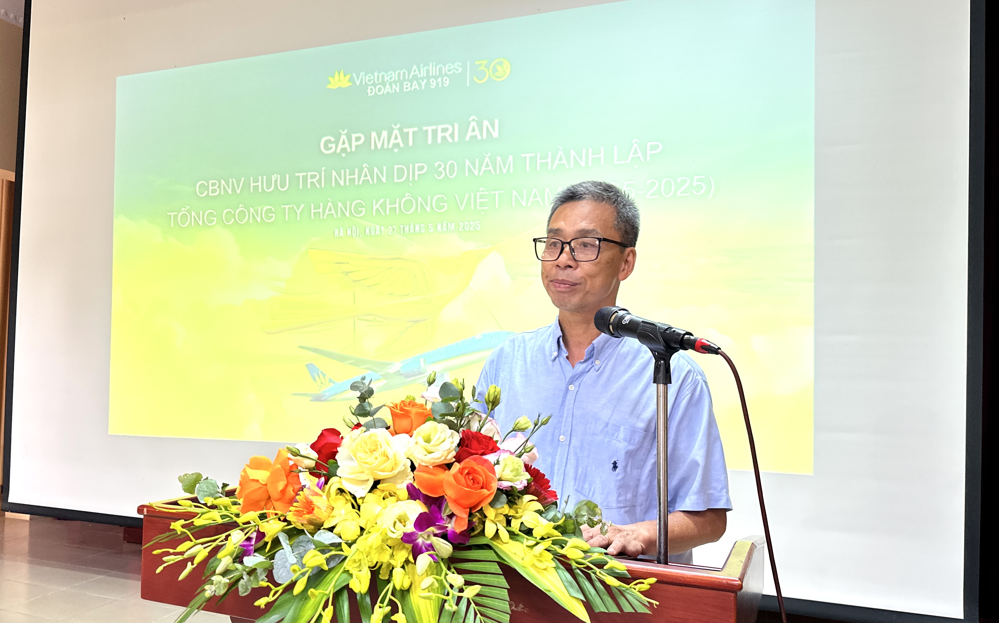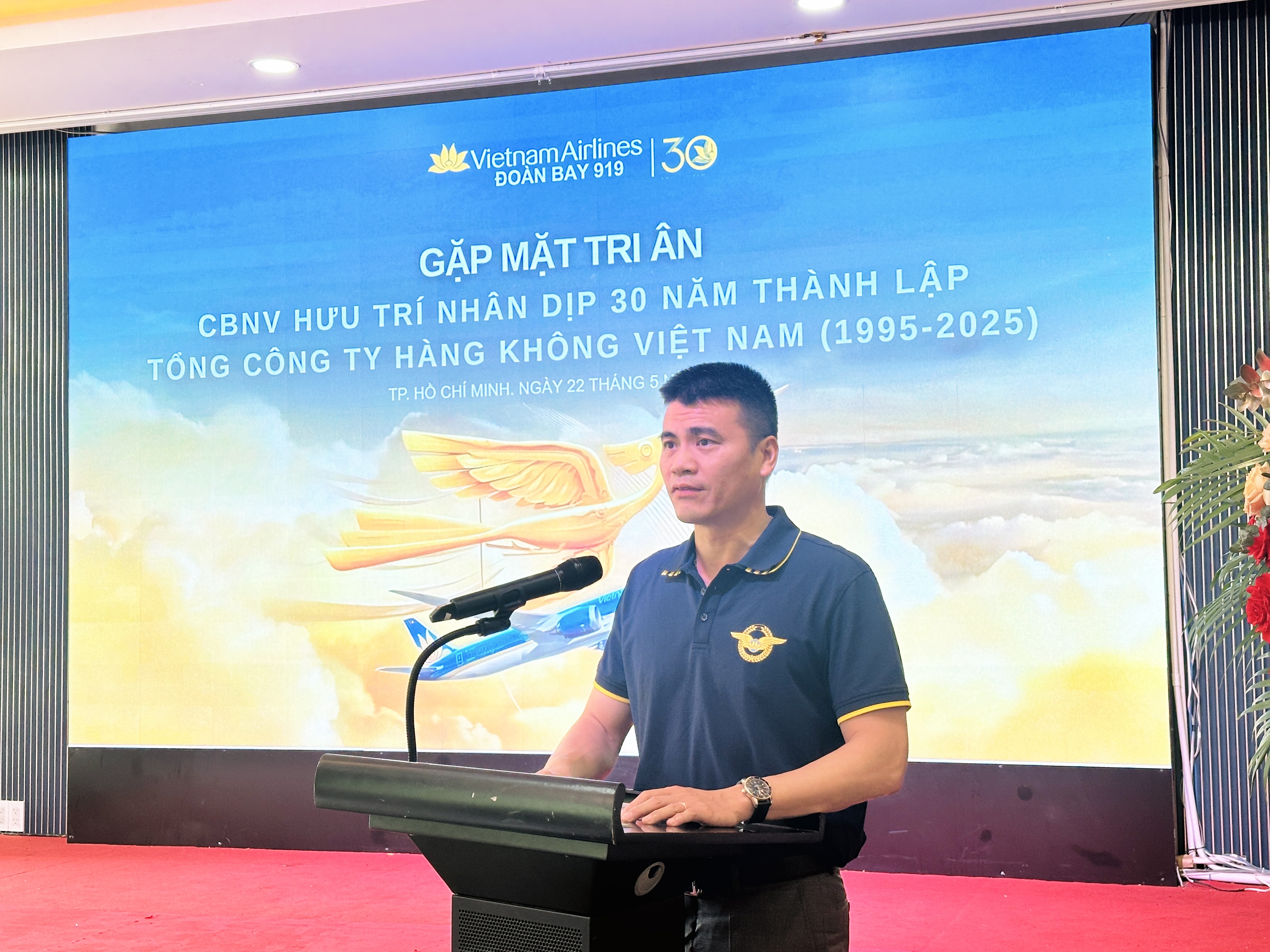 Ông Tô Ngọc Giang nhấn mạnh, thành công hôm nay không thể có nếu thiếu đi sự dấn thân, hy sinh và cống hiến âm thầm của các thế hệ đi trước – những người đã vượt qua gian khổ, đặt từng viên gạch đầu tiên cho hành trình những cánh bay Đoàn bay 919 sát cánh cùng Tổng công ty “cất cánh cùng non sông”: “Nhiều người trong các đồng chí buổi gặp mặt ngày hôm nay đã từng là Sĩ quan Quân đội, từng tham gia điều hành, khai thác những chiếc máy bay thô sơ thuộc thế hệ công nghệ cũ như Li-2, An-2, IL 14… trong điều kiện vô cùng thiếu thốn nhưng với tinh thần “còn người là còn bay”, đã đặt nền móng cho hệ thống khai thác hiện đại ngày nay. Chúng tôi – những người kế thừa – luôn khắc ghi và biết ơn sâu sắc những đóng góp to lớn ấy. Đó là hành trang tinh thần, là giá trị cốt lõi mà Vietnam Airlines gìn giữ và tiếp nối. 30 năm là một dấu mốc quan trọng, đánh dấu sự trưởng thành và phát triển không ngừng của Vietnam Airlines. Đó là kết tinh của những nỗ lực không mệt mỏi của hàng nghìn, vạn cán bộ, nhân viên, những người đã cống hiến hết minh cho sự nghiệp phát triển của ngành Hàng không nói chung và VietnamAirlines nói riêng. Tinh thần ấy là điểm tựa giúp chúng ta vượt qua rất nhiều khó khăn, thách thức như khủng hoảng kinh tế, dịch bệnh, xung đột địa – chính trị, cạnh tranh khốc liệt trên thị trường hàng không, để vững vàng “sải cánh vươn cao”.