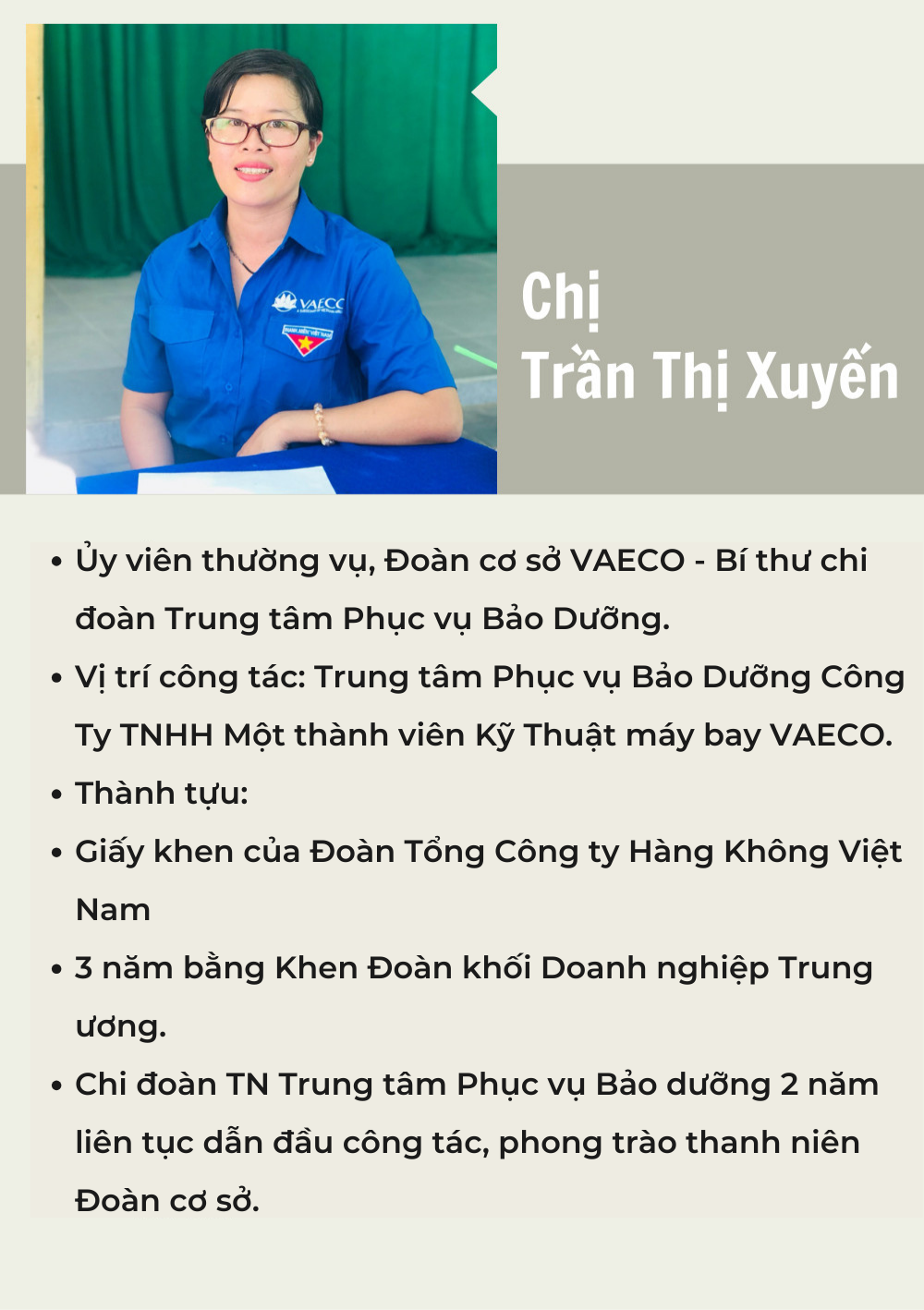 Trong suốt 12 năm tham gia BCH Đoàn cơ sở VAECO, chị Xuyến luôn cảm nhận được sức “nhiệt” từ các Đoàn viên trong BCH và anh chị em. Đây là động lực để chị nỗ lực tham gia mọi hoạt động, từ một người rụt rè “hướng nội” trở nên năng động, tự tin hơn.