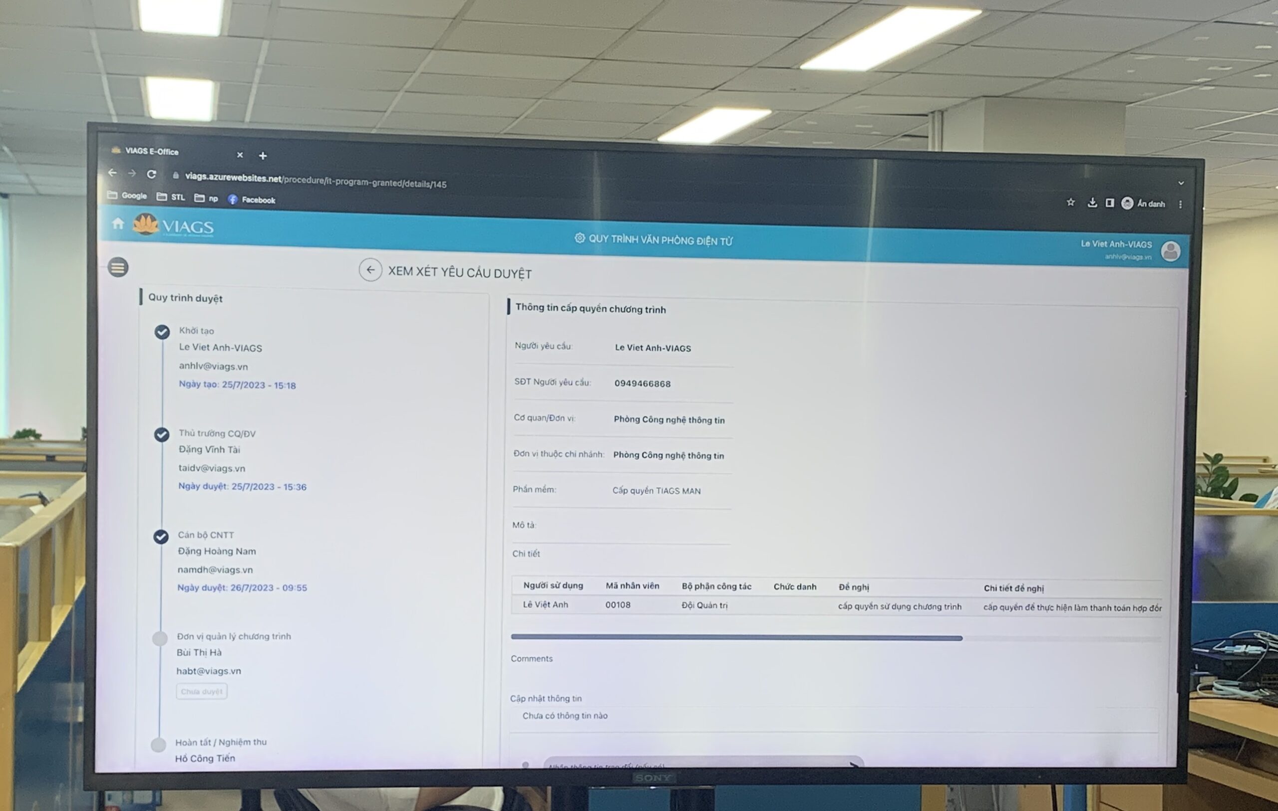 Thêm vào đó, việc triển khai văn phòng điện tử còn thúc đẩy nguồn nhân lực phát triển theo hướng hiện đại và tối ưu năng suất lao động, đồng thời giúp VIAGS tiết kiệm nhiều chi phí như: Các công cụ lưu trữ tài liệu, hồ sơ, không gian lưu trữ, chi phí đi lại…