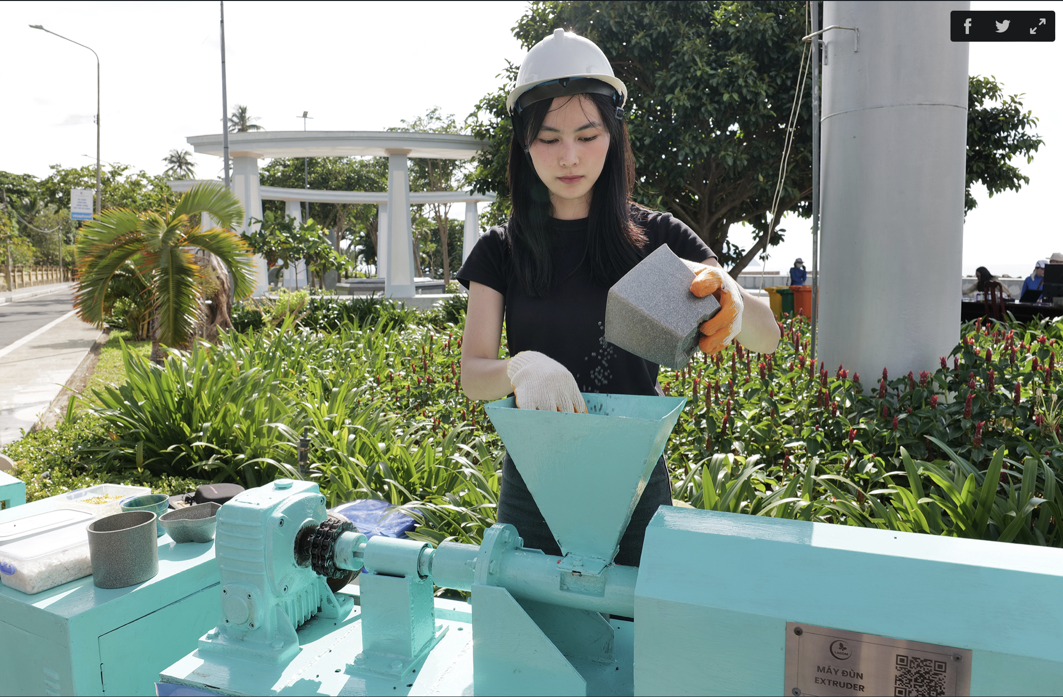Helly Tống trải nghiệm hệ thống máy tái chế dành cho giáo dục và nghiên cứu. Máy công suất không cao, nhưng có thể phân tích các công đoạn để người dùng, đặc biệt là đối tượng học sinh hiểu rõ hơn về quá trình xử lý rác thải.