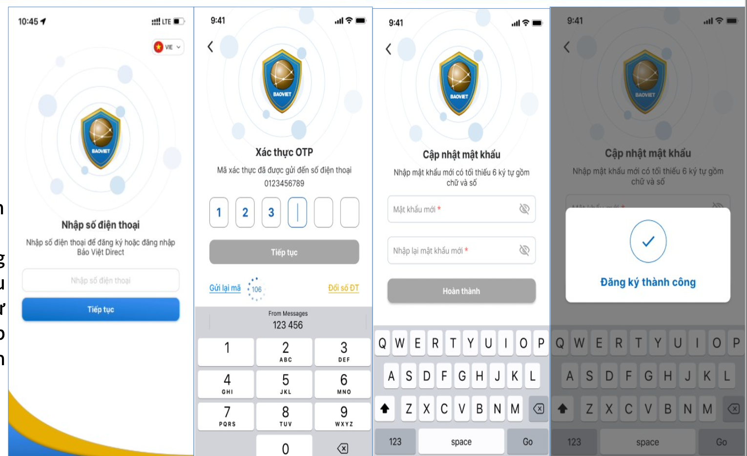 - Nhập mã OTP nhận được qua SMS → Đặt mật khẩu → Hoàn thành → Hệ thống thông báo đăng ký thành công.