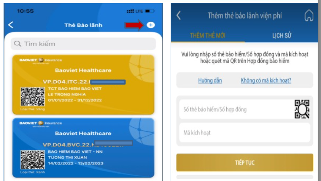 Bước 2: Trong trường hợp thẻ không tự động đồng bộ, tự thêm thẻ/đồng bộ thẻ và mã kích hoạt mà Bảo hiểm Bảo Việt cung cấp thông qua email của CBNV:
