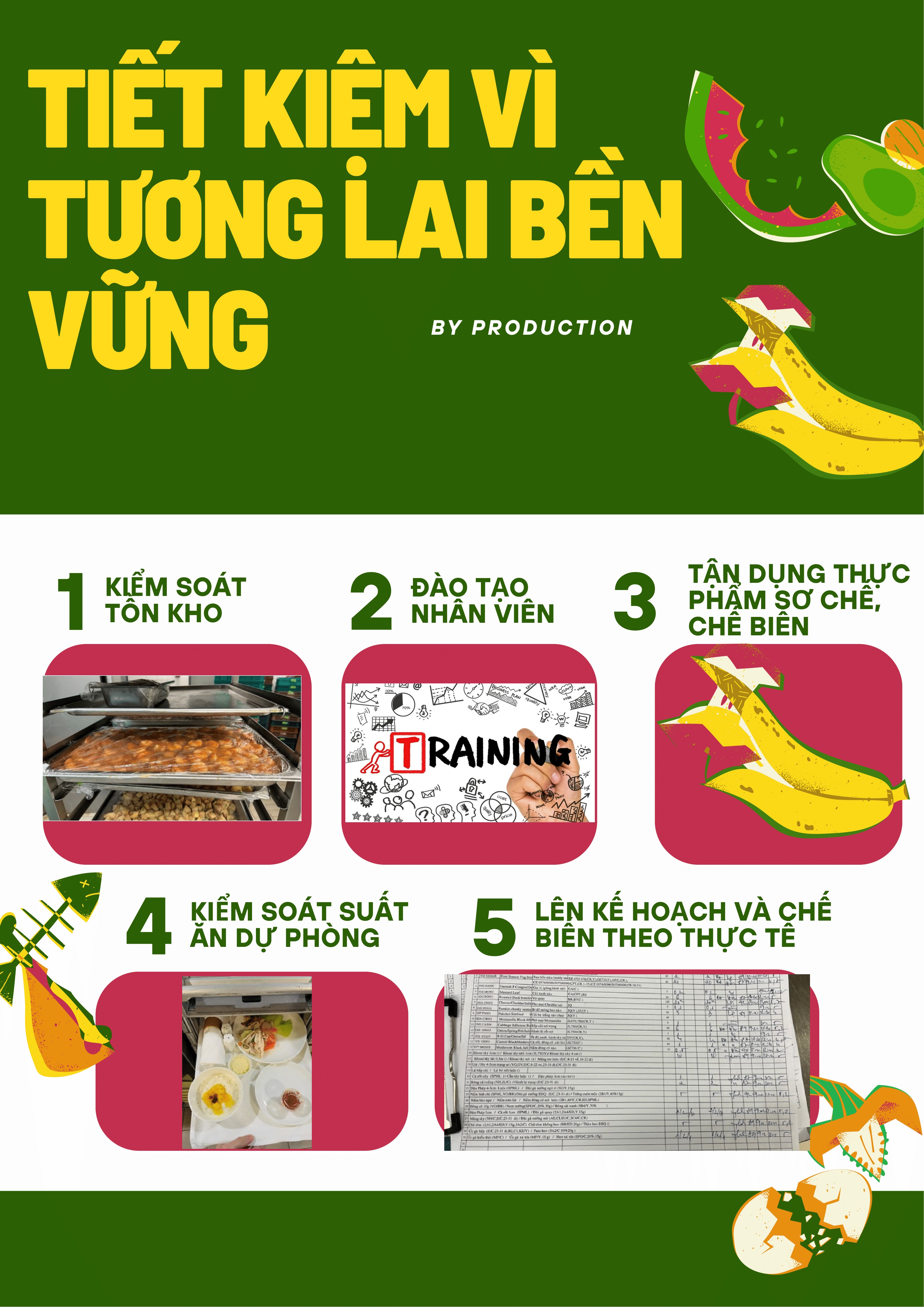 Lập kế hoạch nguyên vật liệu sát với kế hoạch sản xuất, cập nhật định mức tiêu chuẩn theo từng thực đơn.