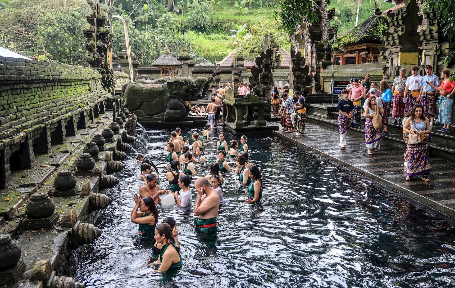 Trong khuôn viên của đền Tirta Empul có 23 đài phun nước, được sử dụng để thực hiện nghi thức tẩy trần. Theo phong tục, sau khi cầu nguyện, người dân và du khách cúi đầu dưới dòng nước trong vắt đang tuôn trào. Nước thánh từ vòi được đưa lên đầu ba lần và uống một lần với hy vọng có thể gột rửa được tâm hồn.