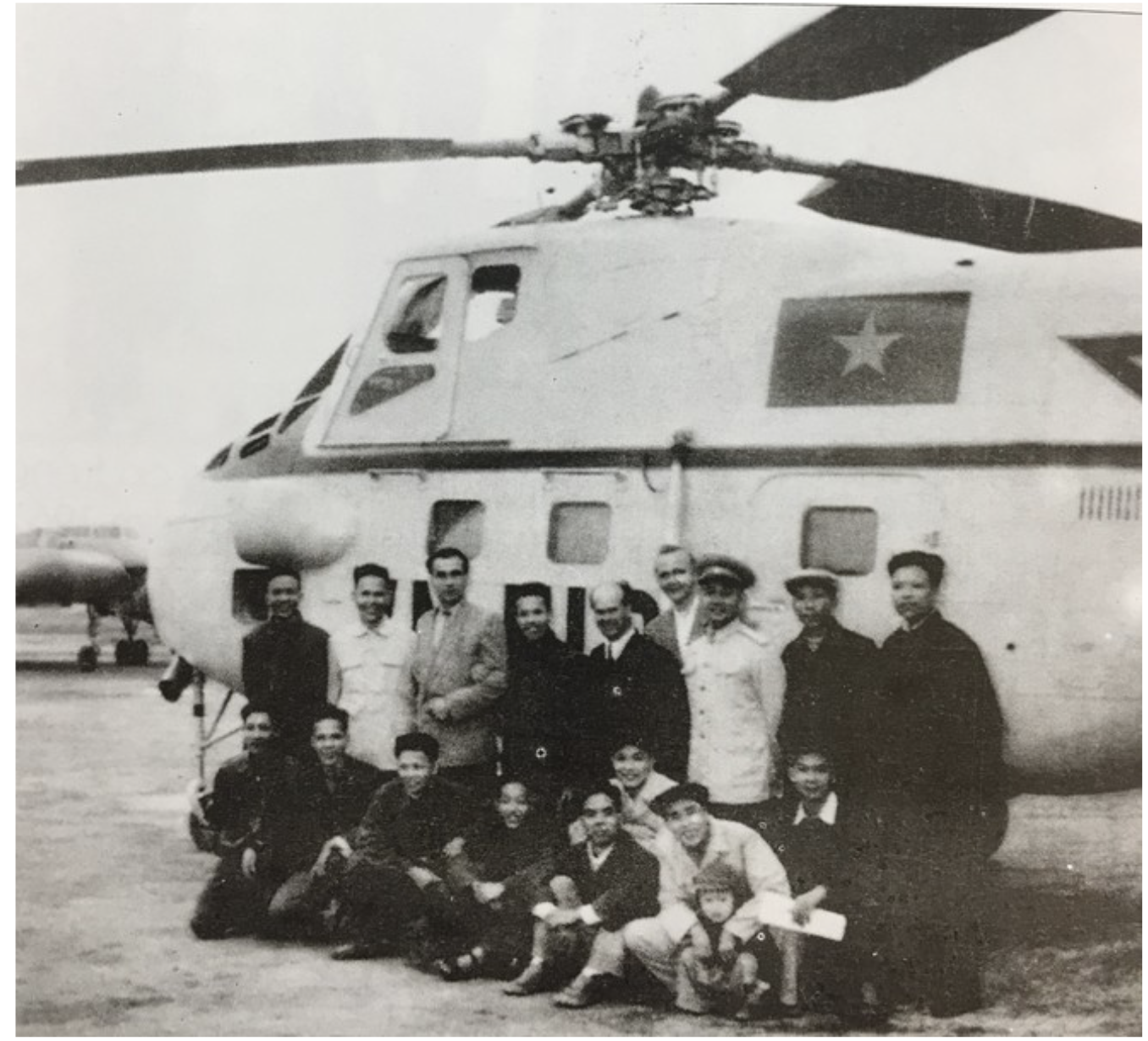 Các máy bay Mi-1, Mi-4 và Mi-6 là dòng máy bay lên thẳng, chở người, chở hàng. Ảnh: Đồng chí Đặng Tính, Cục trưởng Cục Không quân chụp ảnh cùng tổ bay chuyên cơ Mi-4 tại sân bay Gia Lâm-năm 1960. (Ảnh: Sưu tầm)
