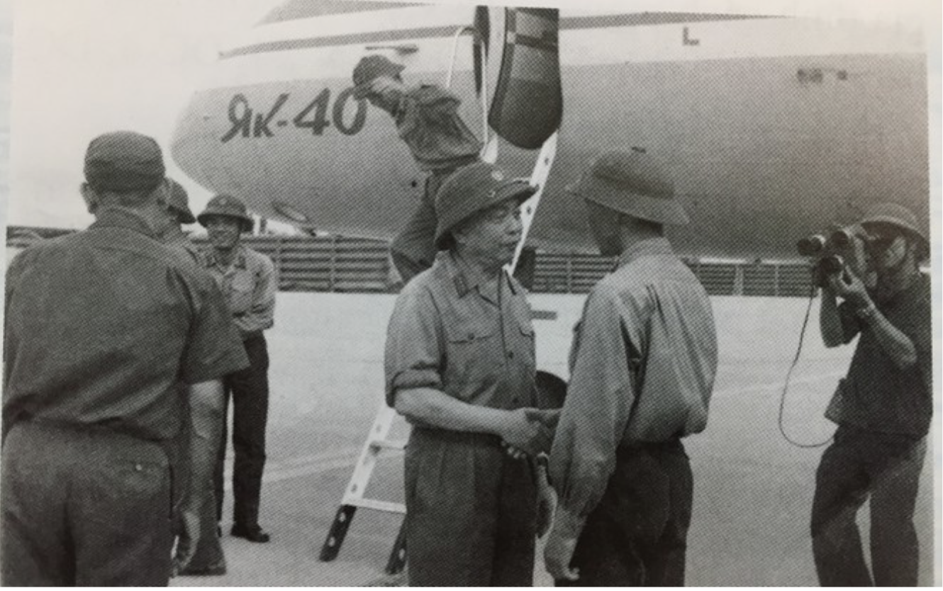 Đại tướng Võ Nguyên Giáp chúc mừng tổ bay Yak40 hoàn thành nhiệm vụ. (Ảnh: Sưu tầm)