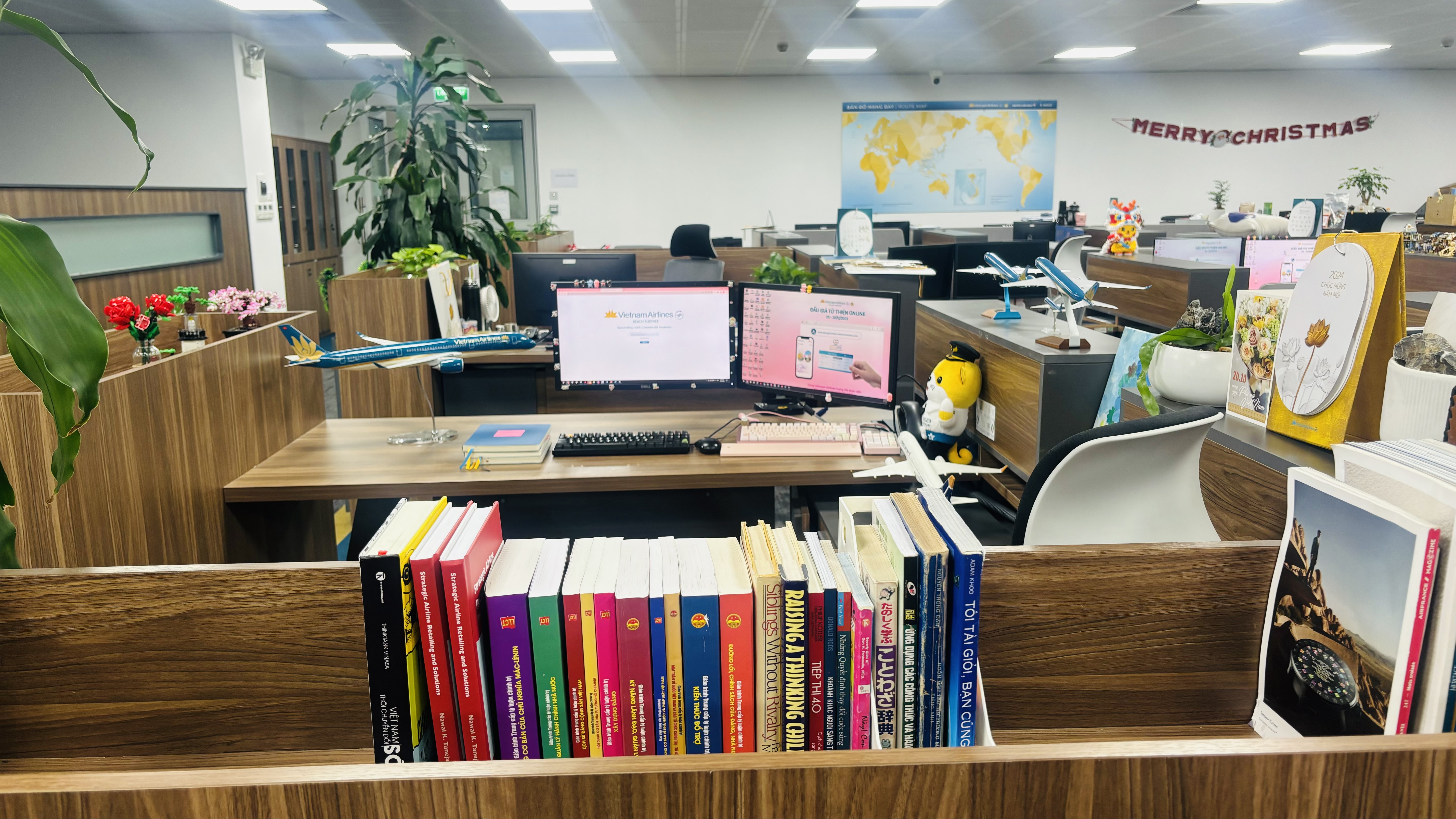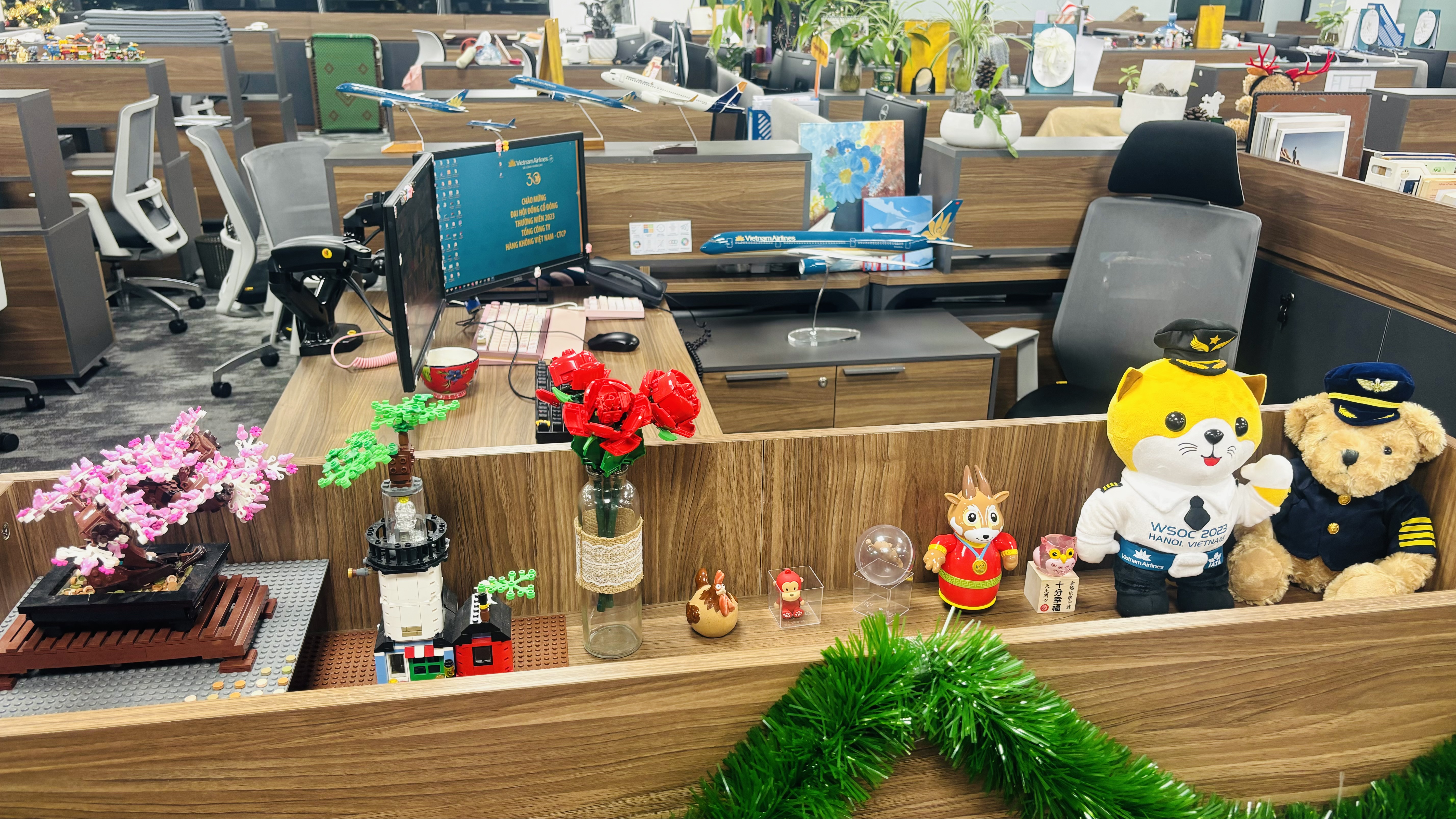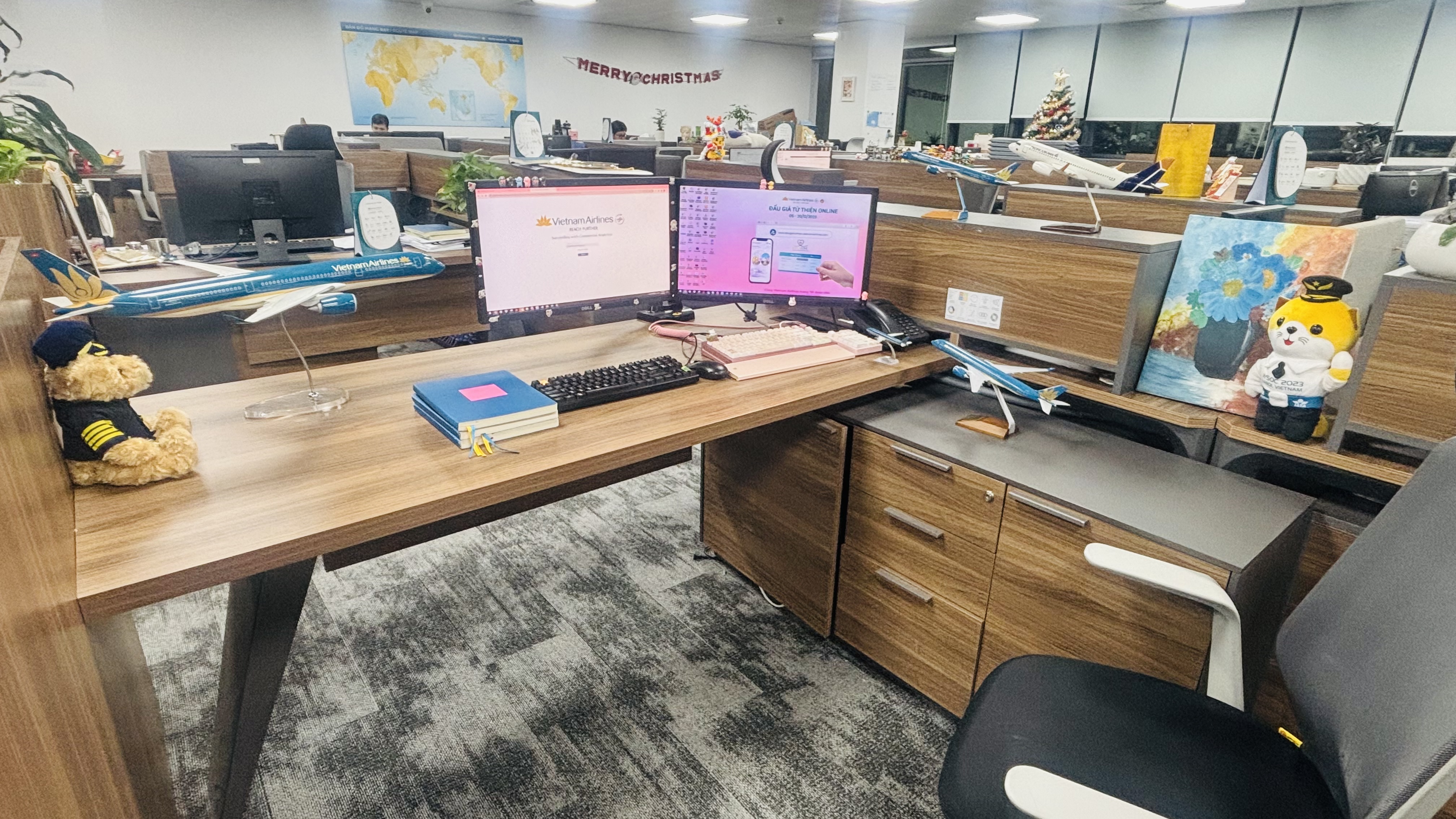 Góc làm việc cũng âm thầm “khoe khoang” một chút thành công trong công việc của tôi với một mô hình máy bay được tặng thưởng thành tích chiến sỹ thi đua, một mô hình máy bay khi tham gia cuộc thi online của Vietnam Airlines, một con gấu nhỏ đích thân Phó Tổng Giám đốc tặng sau 2 năm tham gia Mentor cho cuộc thi Đại sứ Sinh viên Vietnam Airlines Youth Travel Award. Bàn làm việc gọn gàng, sạch sẽ, và vui tươi, giúp tôi tăng năng suất lao động trong ngày.