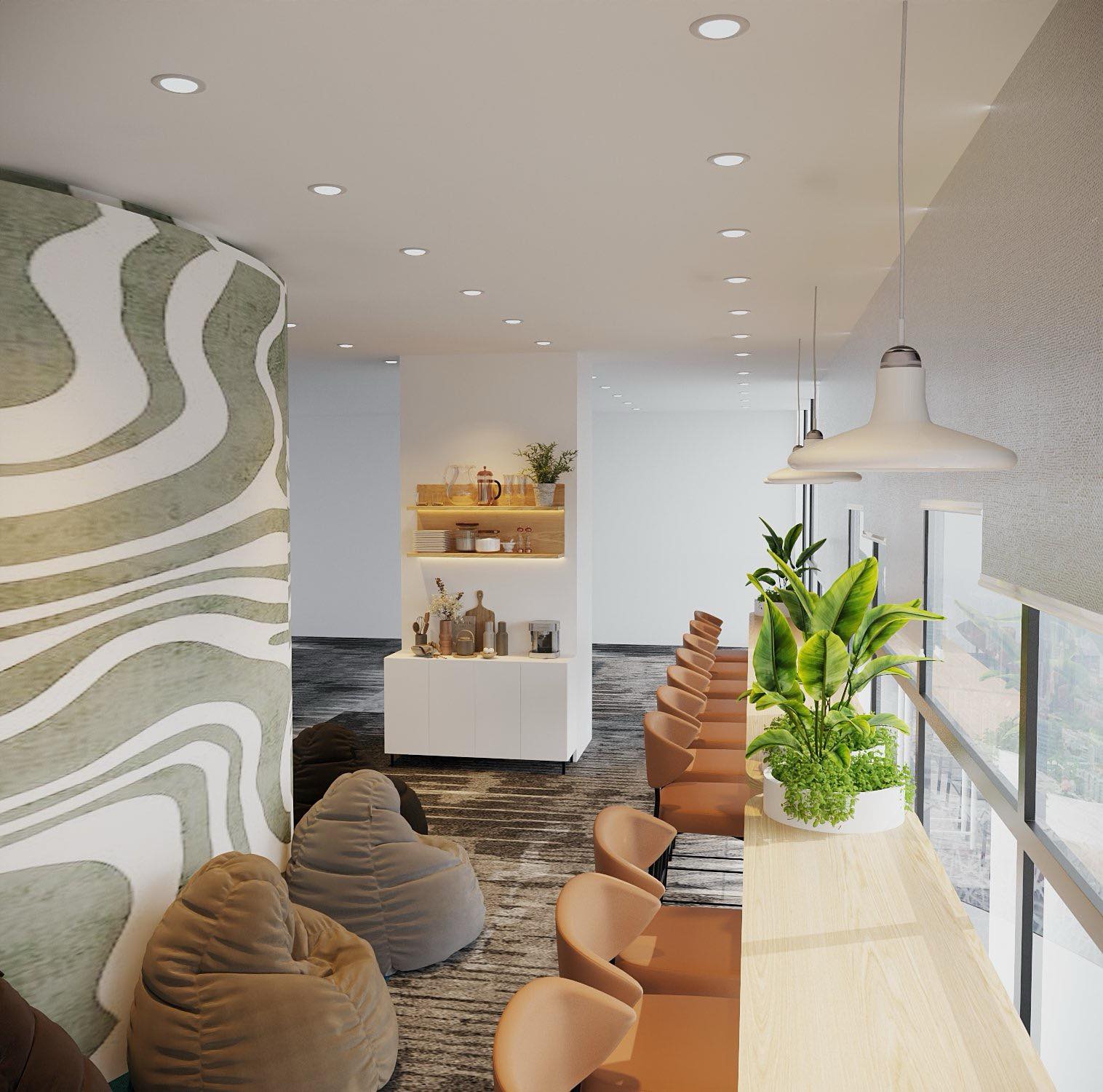 - Bên cạnh đó là dãy cột tròn sẵn có của tòa nhà nên sử dụng phương pháp vẽ những đường cong uốn lượn tạo cảm giác thư giãn, dưới chân cột là dãy ghế lười xốp để có ngả lưng thoải mái.