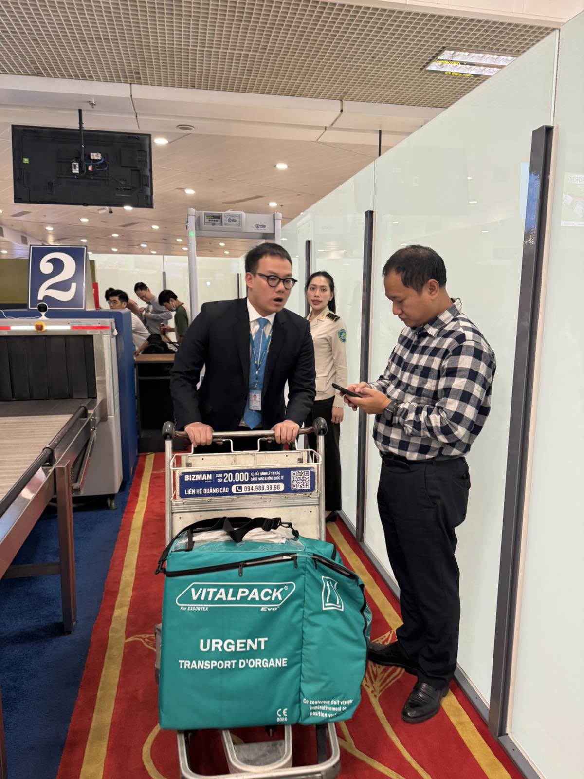 Khi đoàn đến sân bay lúc 14h20, đội ngũ DVKT tại Sân bay Nội Bài đã phối hợp với VIAGS hỗ trợ đưa đoàn và 03 kiện hàng lạnh đựng tạng qua kiểm tra an ninh và ra thẳng tàu bay. Đến 14h30, tổ tiếp viên tiếp nhận tạng, bố trí vị trí cố định an toàn trên khoang và hỗ trợ đoàn ổn định chỗ ngồi.