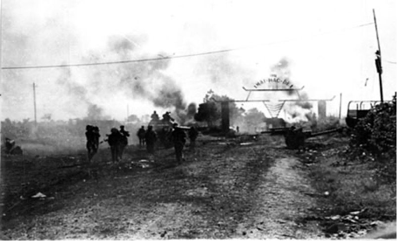 Bộ binh và xe tăng quân Giải phóng tiến công thị xã Xuân Lộc, mở toang cánh cửa tiến về Sài Gòn. (Ảnh: ST)