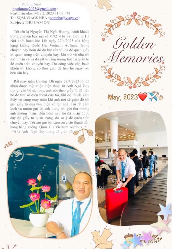 Nhận lại bộ giấy tờ quan trọng được bảo quản nguyên vẹn, chị Hương rất cảm kích trước sự tận tâm, chu đáo của anh Ngô Duy Long. Ngay sau đó, chị Hương đã gửi thư về VIAGS NBA để chia sẻ thông tin sự việc và cảm ơn anh Long cùng Vietnam Airlines.