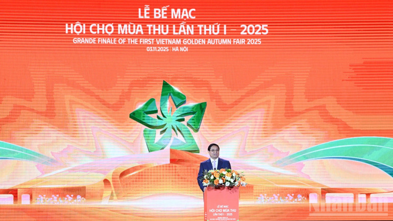 Thủ tướng Chính phủ Phạm Minh Chính phát biểu ý kiến tại Lễ bế mạc Hội chợ Mùa Thu lần thứ I năm 2025. (Ảnh: TRẦN HẢI)