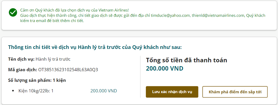 Bước 4: Sau khi thanh toán thành công, khách nhận được xác nhận trên màn hình. Khách có thể ấn nút Lưu xác nhận dịch vụ hoặc Khám phá điểm đến sắp tới.